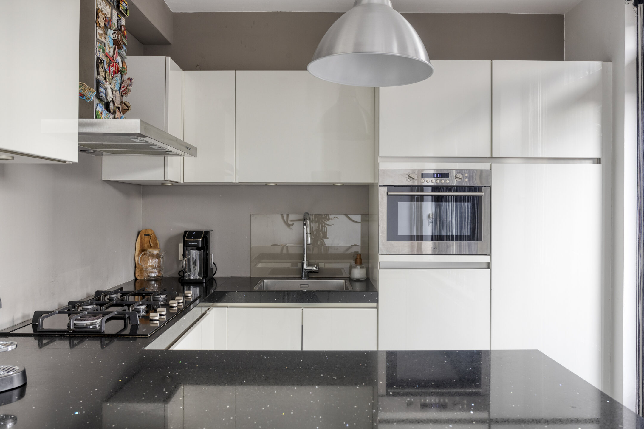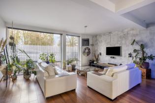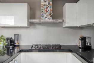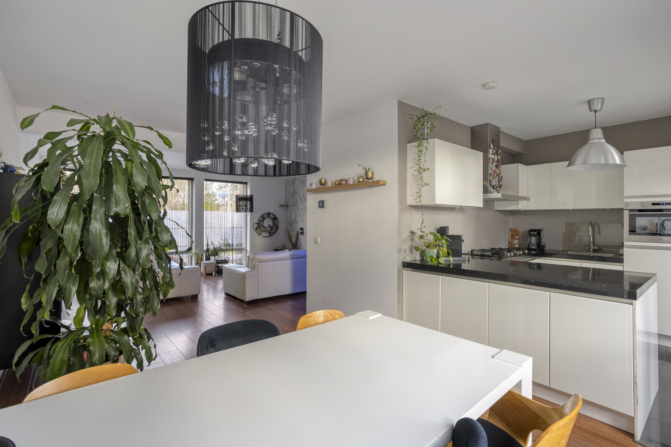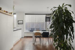 The open kitchen is practically arranged and equipped with a gas cooktop, combi microwave/oven, extractor hood, refrigerator, dishwasher, and ample cupboard space. The kitchen connects directly to the dining area, with space for a large dining table. From the kitchen, you also have direct access to the backyard.