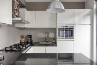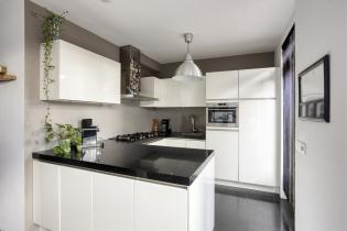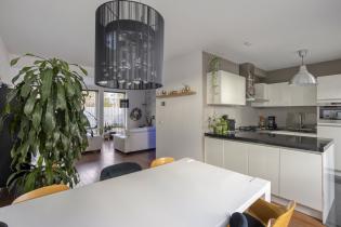 De open keuken is praktisch ingericht en voorzien van o.a. gaskookplaat, combi- magnetron/oven, afzuigkap, koelkast, vaatwasser en voldoende kastruimte. De keuken grenst direct aan de eethoek, met ruimte voor een grote eettafel. Via de keuken is er ook direct toegang tot de achtertuin.