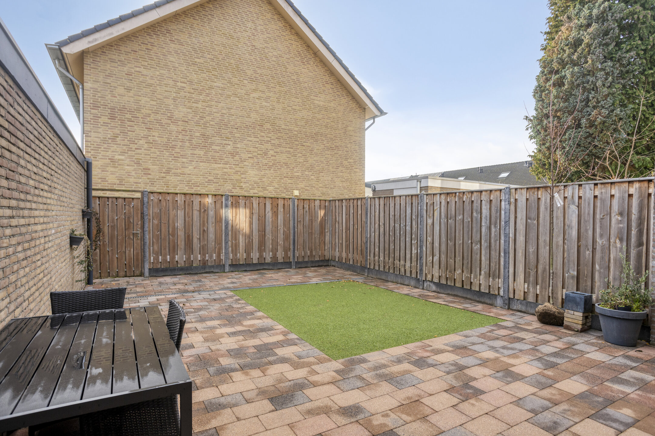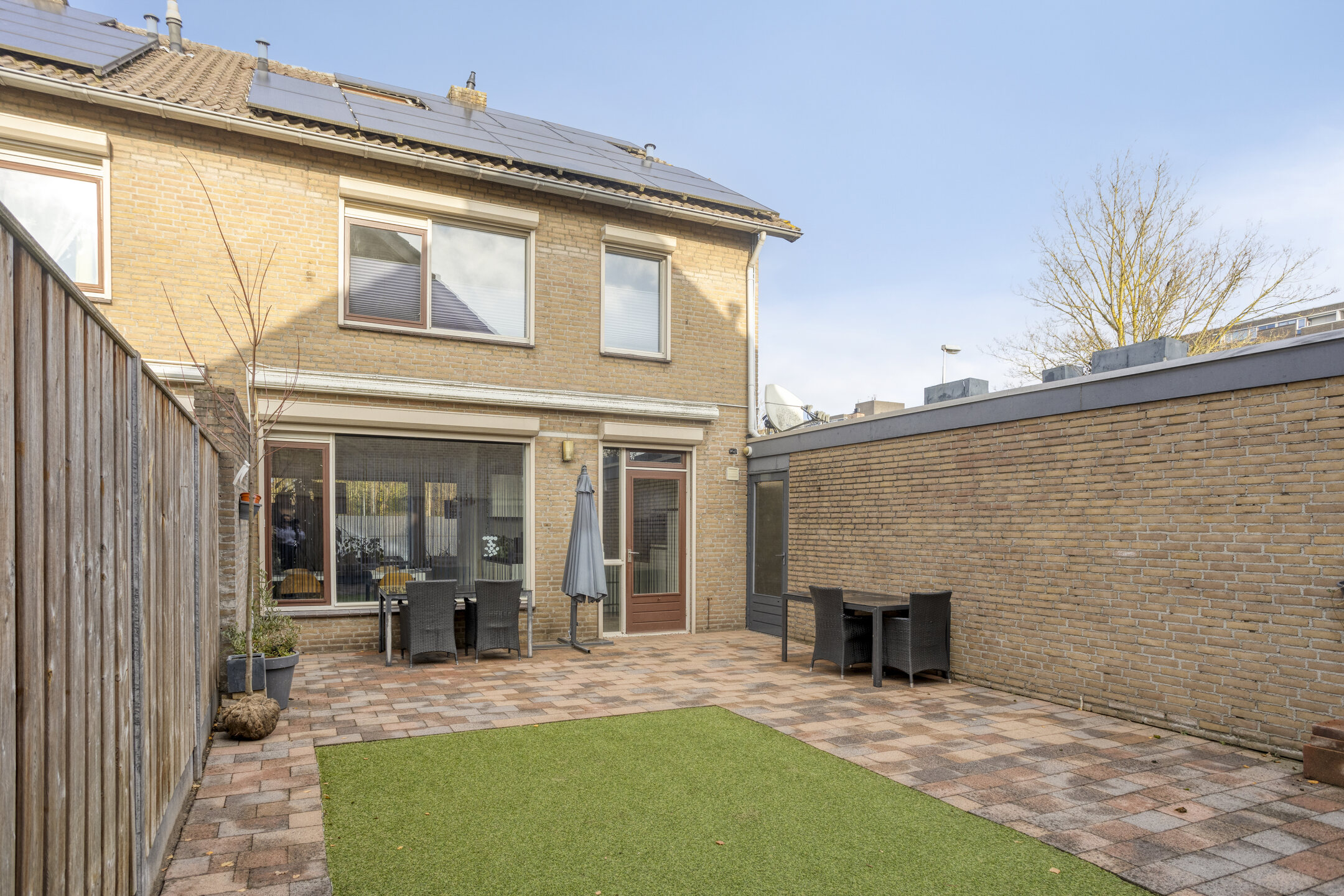 De onderhoudsvriendelijke achtertuin is volledig bestraat en voorzien van een strak kunstgrasvlak en een handige achterom. De tuin biedt veel privacy en ruimte voor meerdere zitplekken, spelen en buiten eten. Via de achtertuin heb je direct toegang tot de eerste garage.