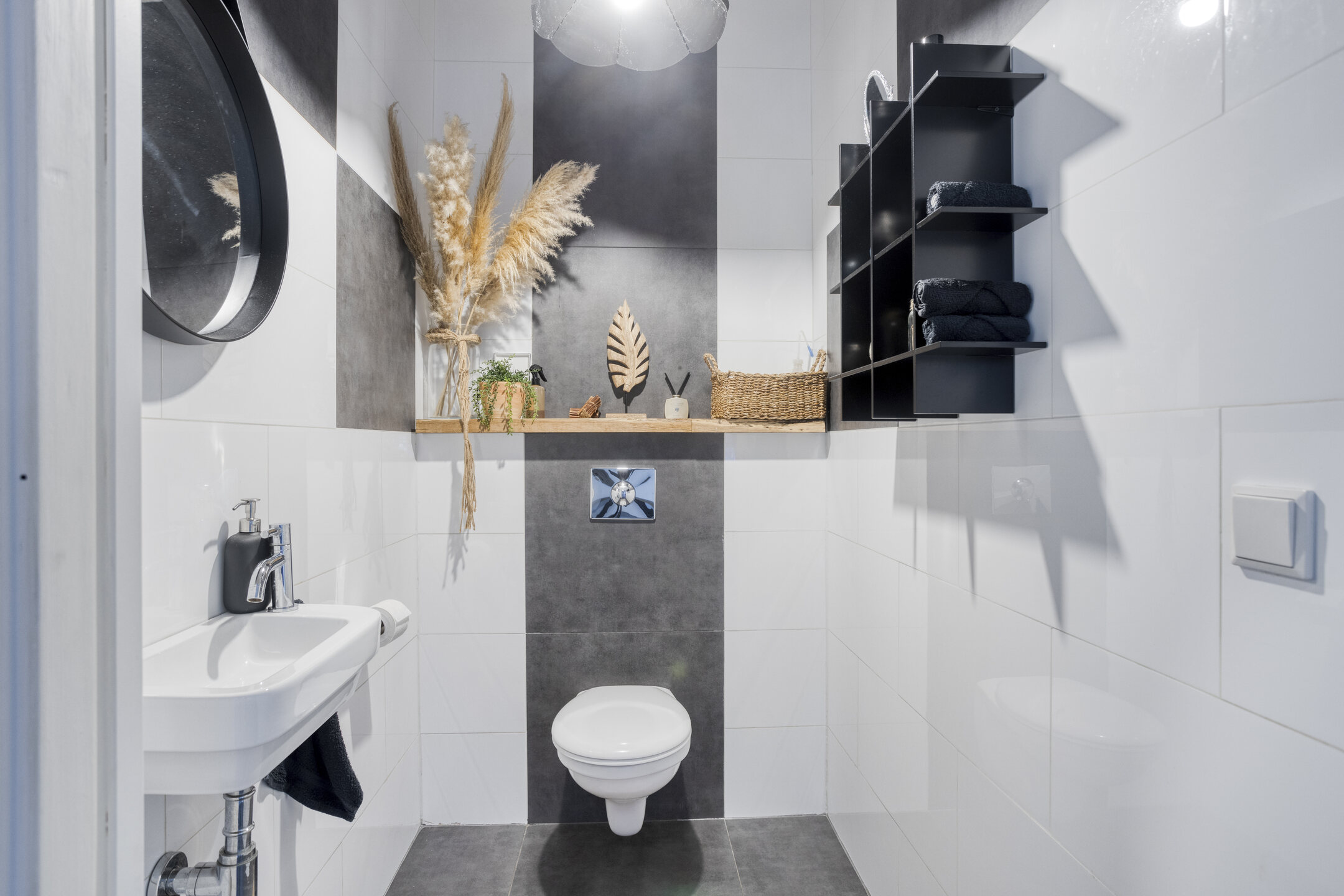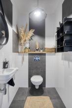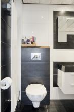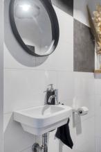 Het moderne toilet is volledig betegeld en voorzien van een zwevend closet met fonteintje.