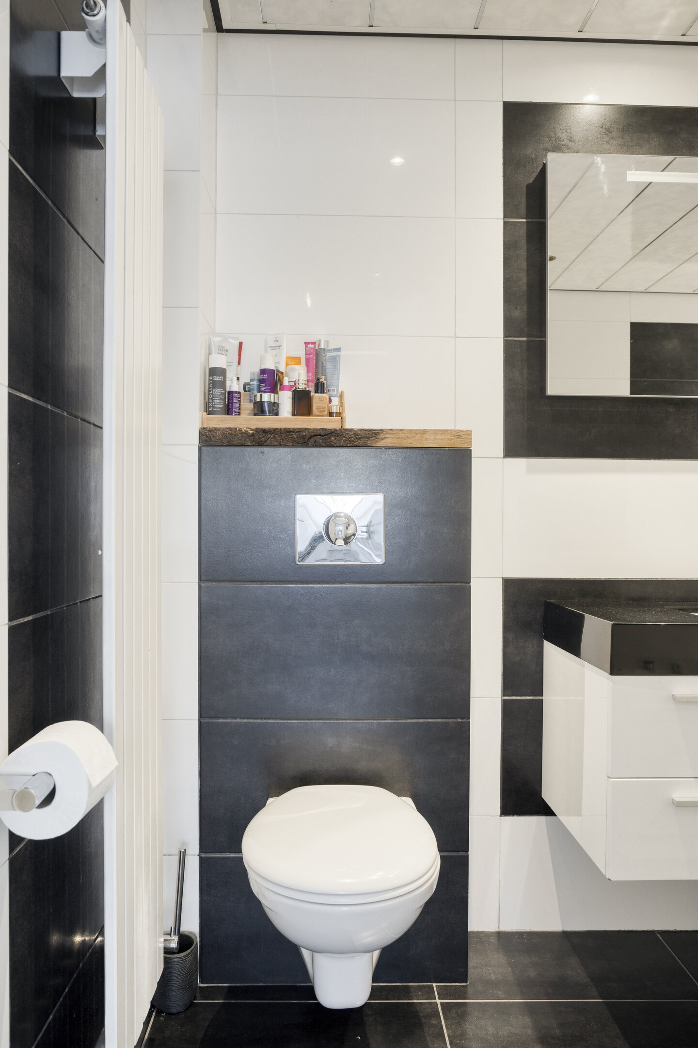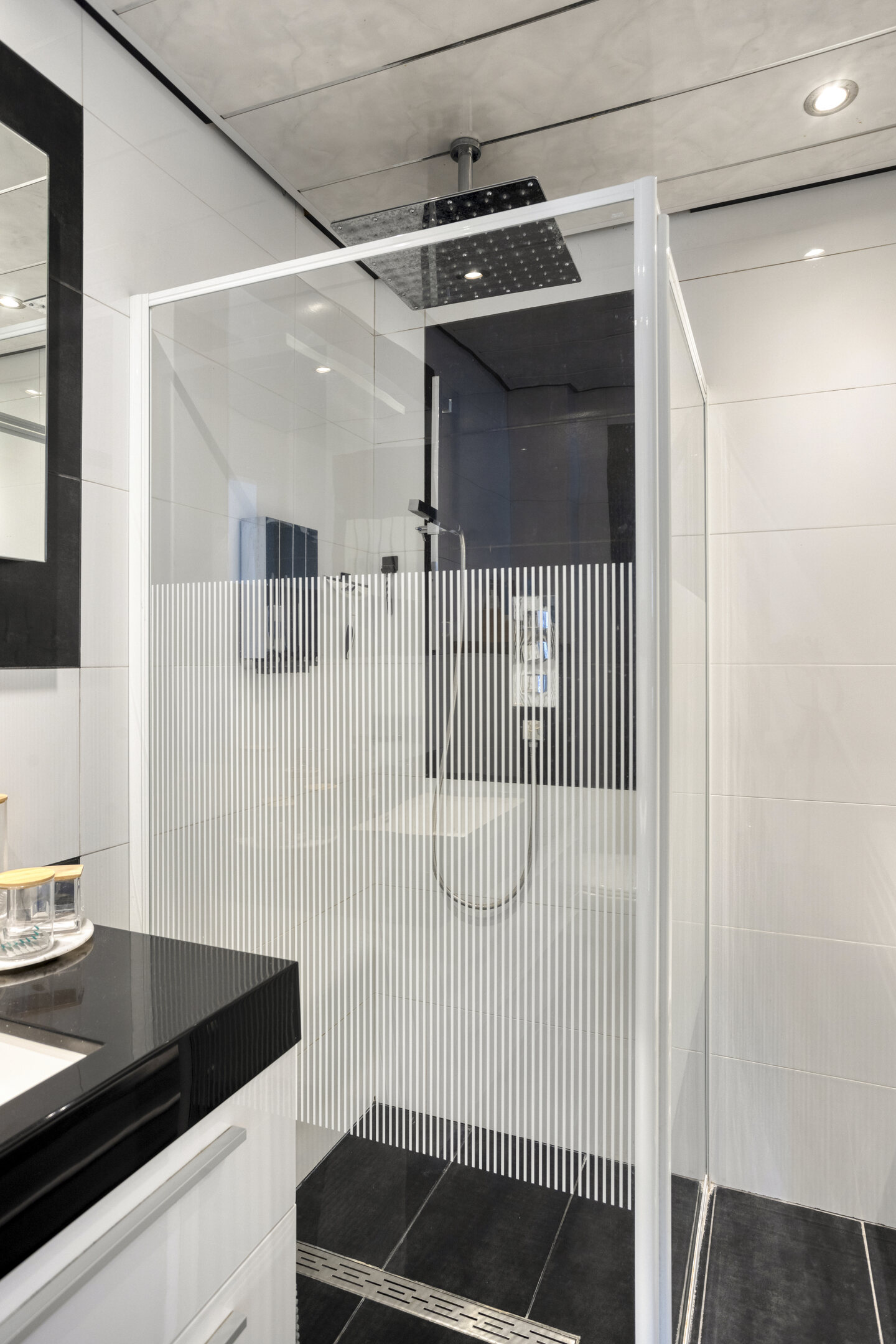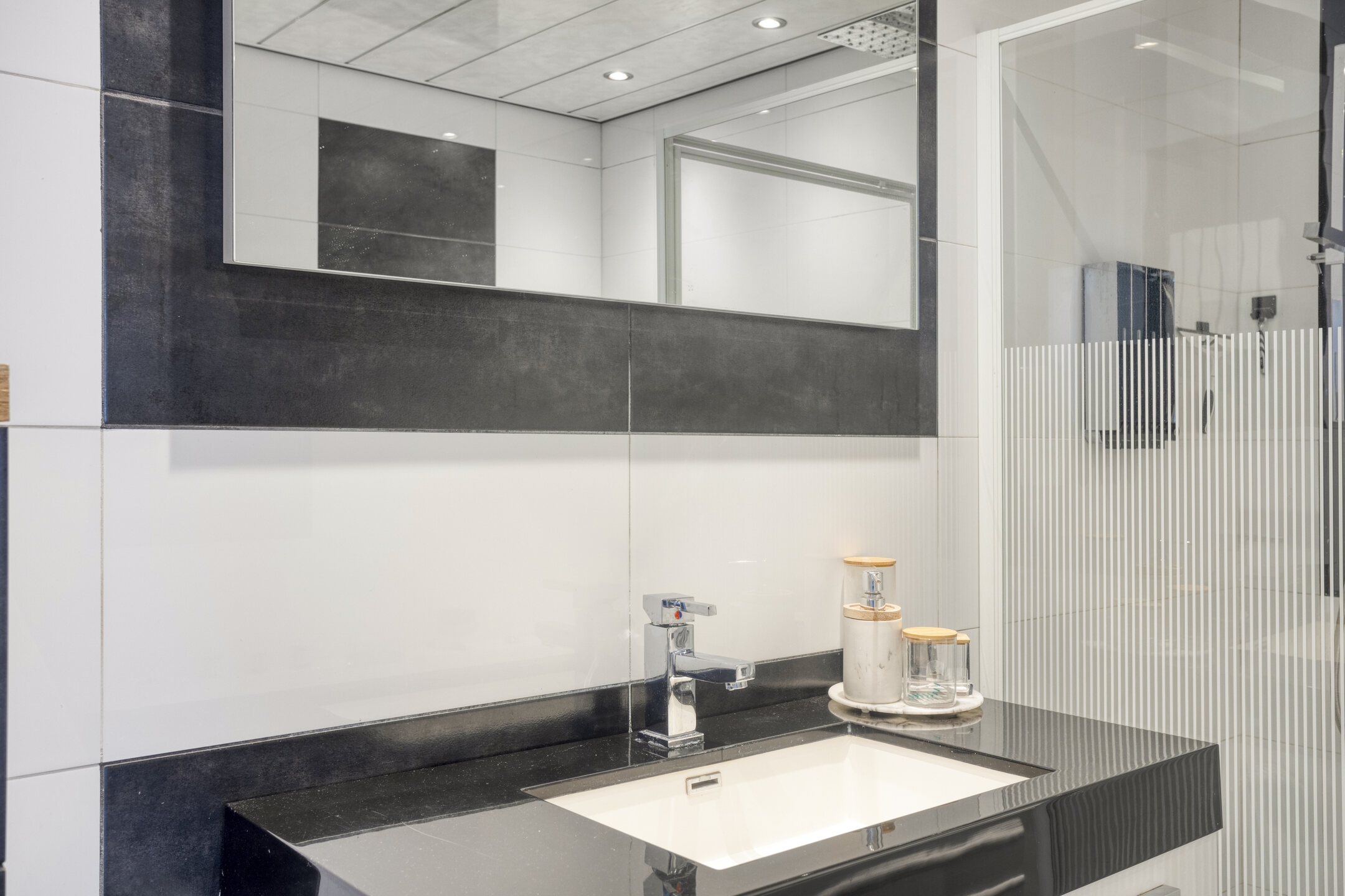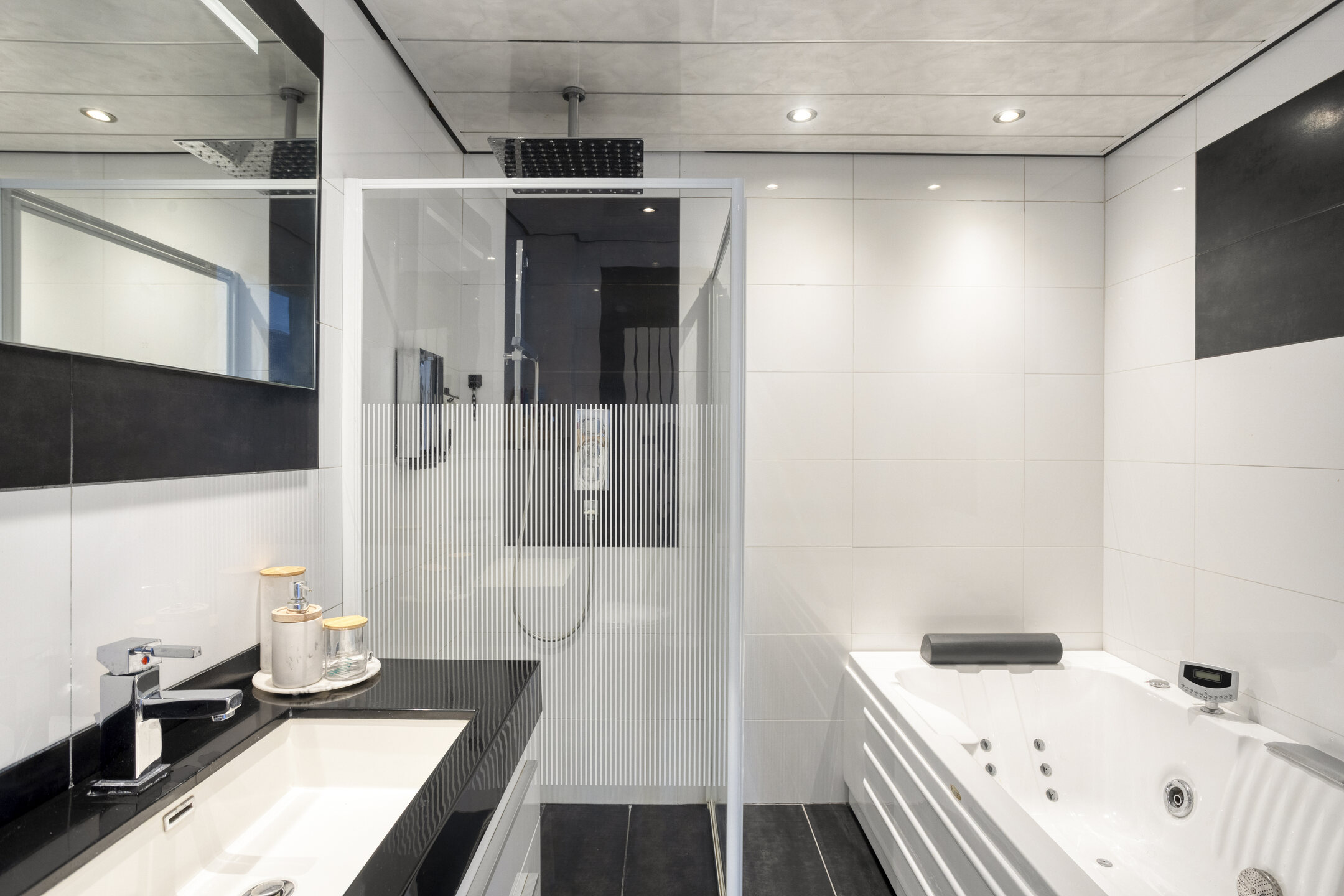 De moderne badkamer is strak afgewerkt, volledig betegeld en voorzien van een whirlpool, een ruime inloopdouche met regendouche, een zwevend closet en een wastafel in meubel.