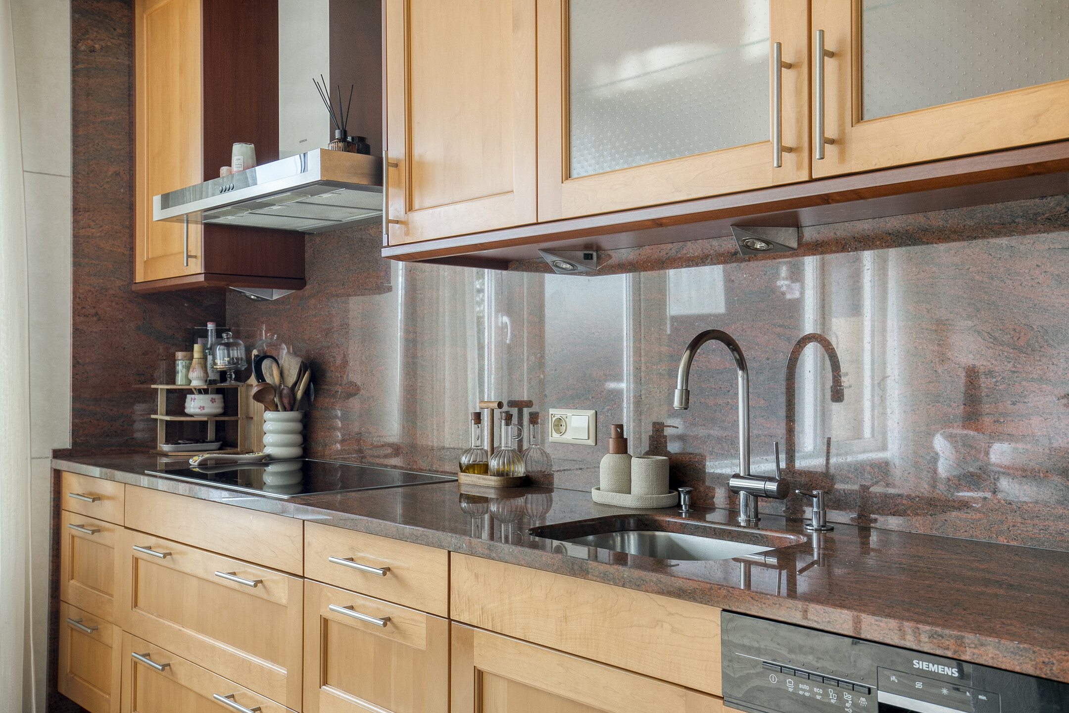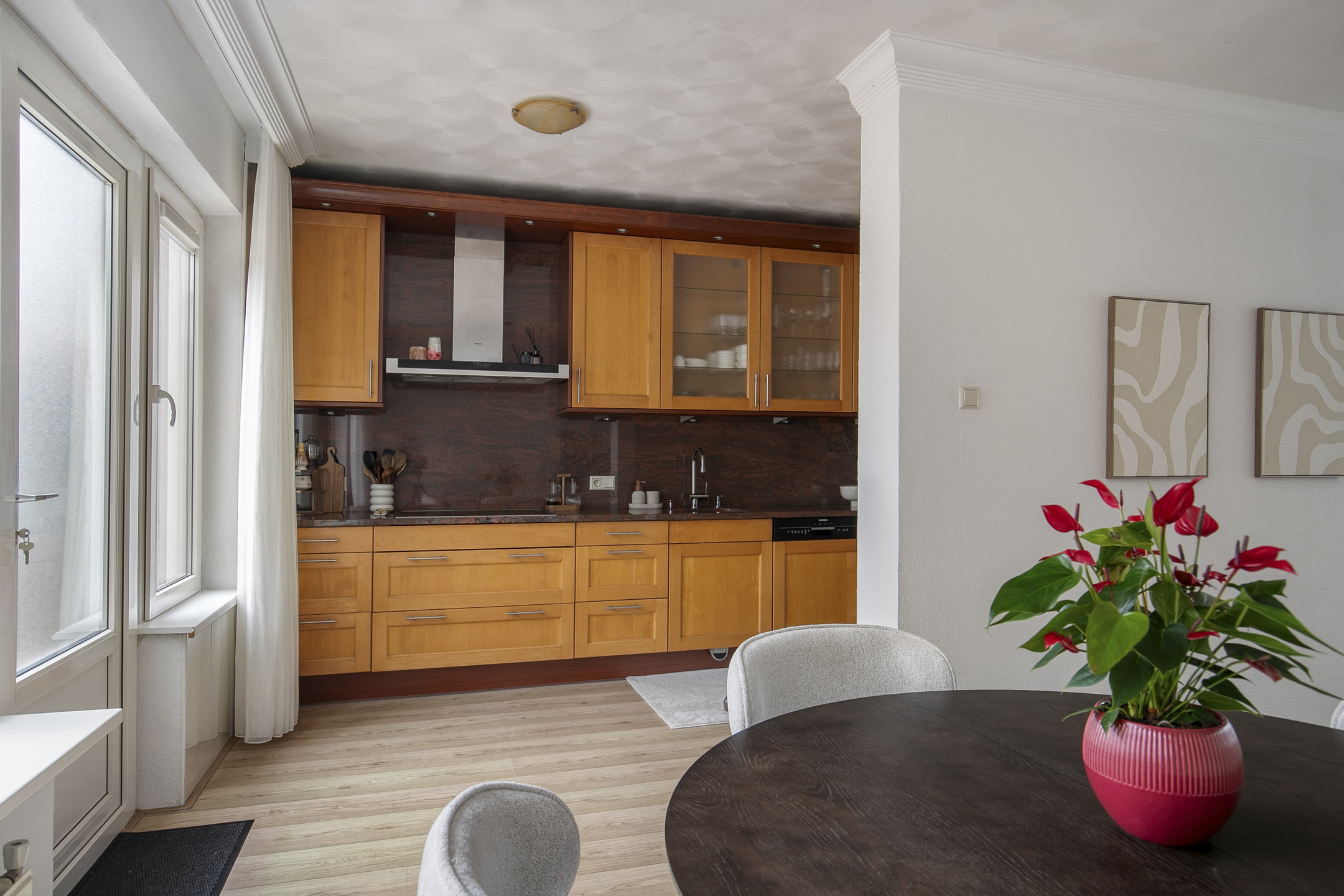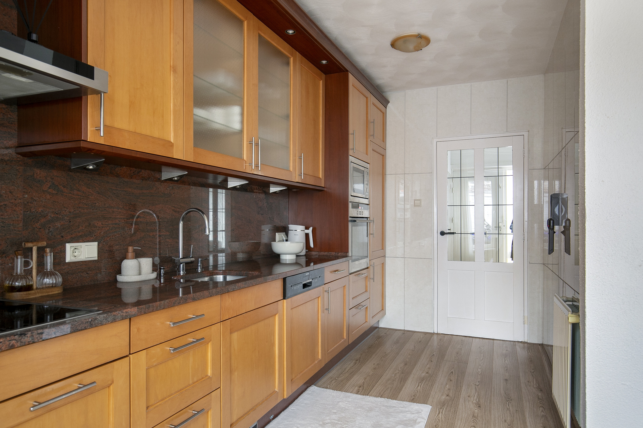 De keuken is uitgevoerd in een rechte opstelling met een granieten aanrechtblad en voorzien van diverse Siemens inbouwapparatuur, waaronder een inductiekookplaat, combi-oven, vaatwasser, afzuigkap en koel-vriescombinatie. Vanuit de keuken is er directe toegang tot de achtertuin.