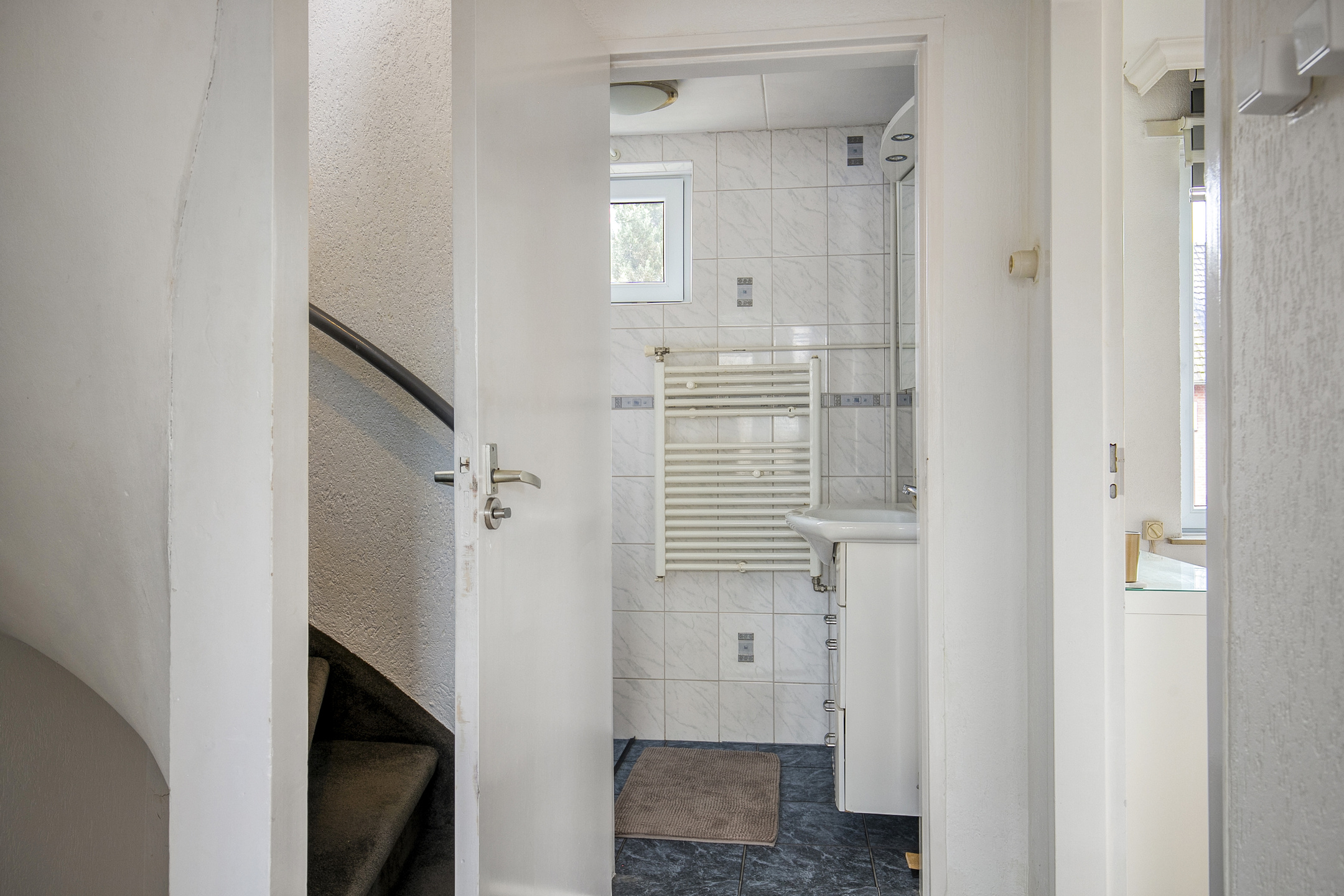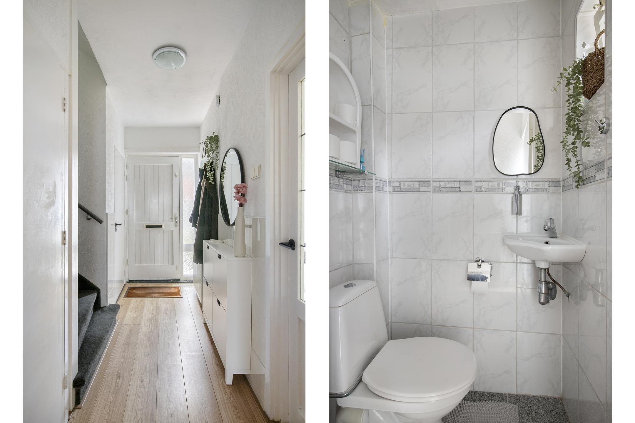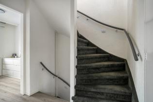 Via de entree kom je in de hal met toiletruimte, trapopgang en trapkast met meterkast. Vanuit hier is er toegang tot zowel de keuken als de woonkamer. De woonkamer is licht en ruim opgezet en afgewerkt met strak stucwerk, sierlijsten en een nette laminaatvloer.