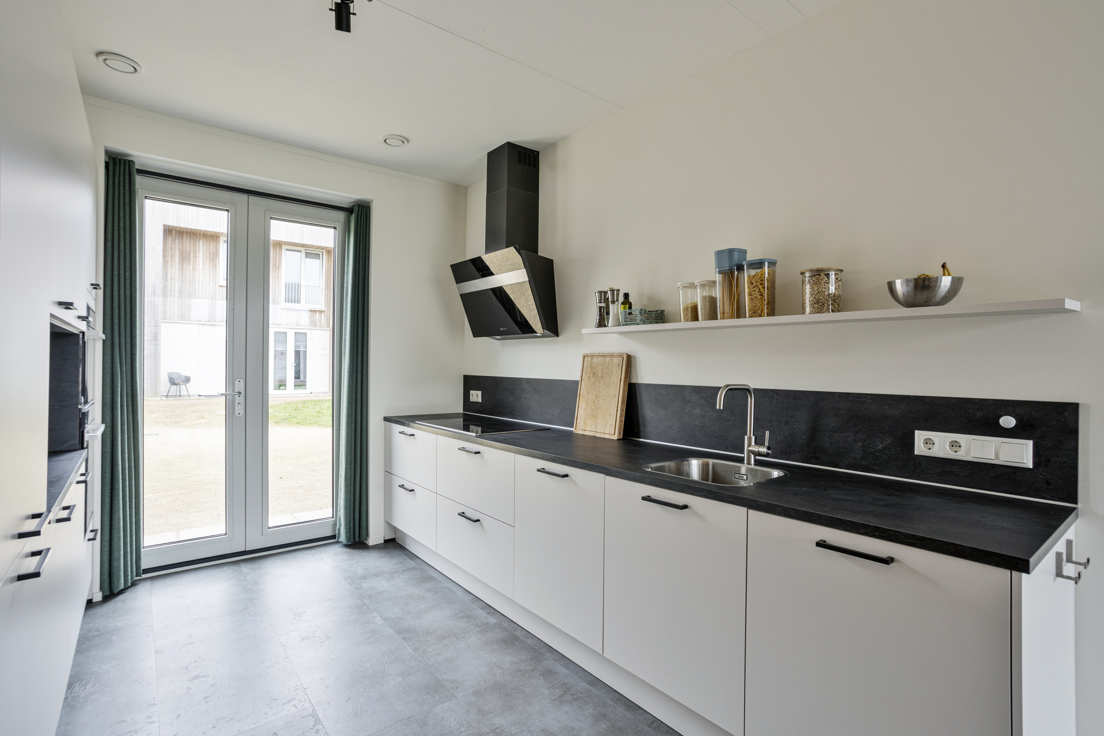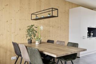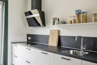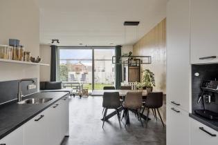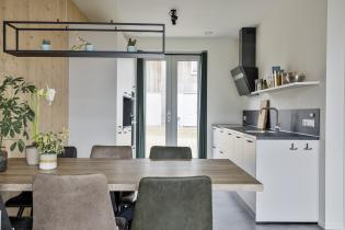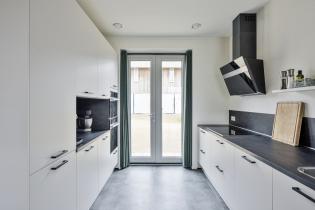 De moderne open keuken is uitgevoerd in een dubbele wandopstelling en voorzien van hoogwaardige inbouwapparatuur, waaronder een inductiekookplaat, afzuigkap, spoelbak, vaatwasser, combi-oven en separate oven. Openslaande deuren zorgen voor een fijne verbinding met buiten.