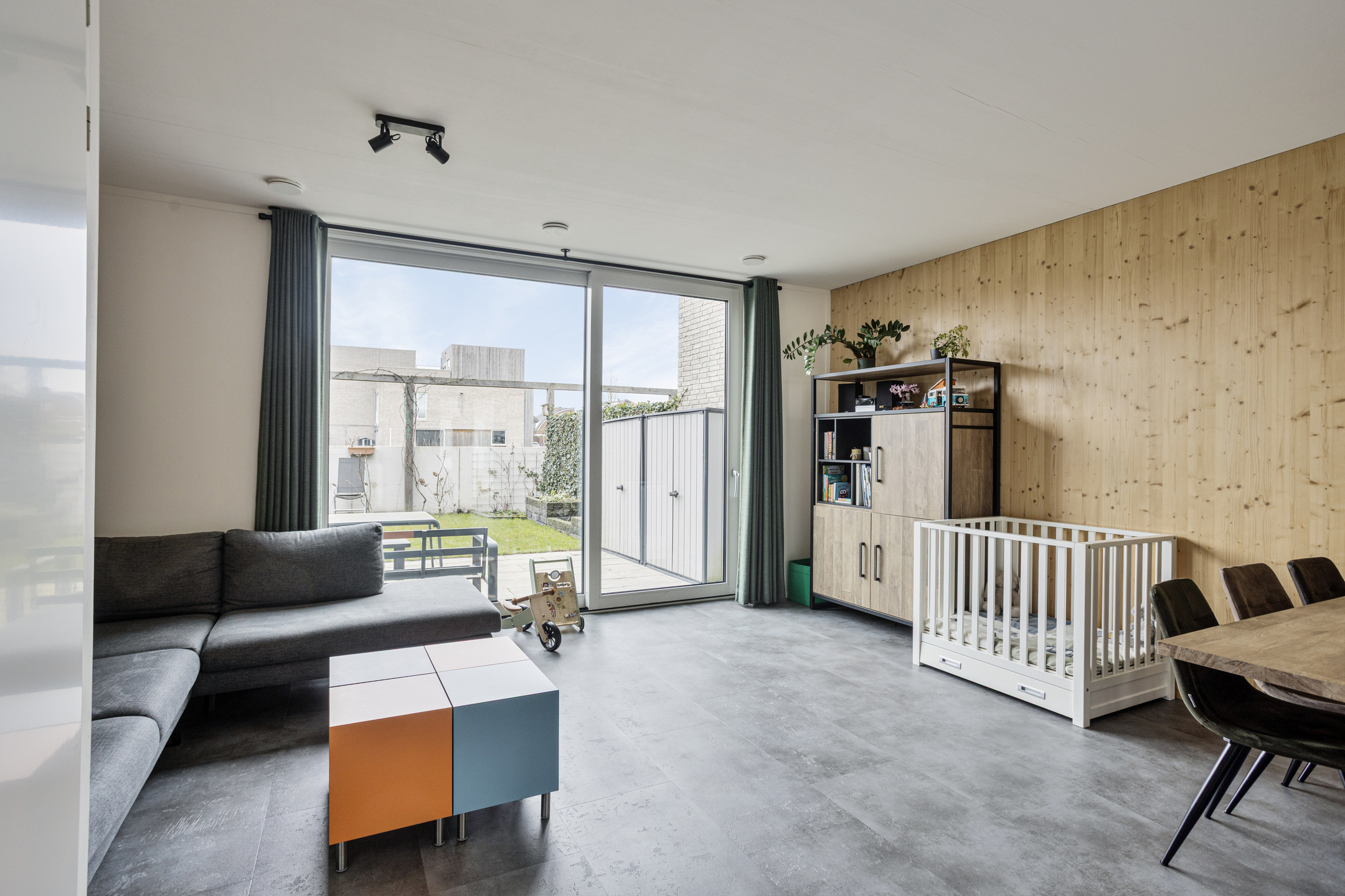 The inviting living room features a PVC floor with underfloor heating, a practical under-stairs storage cupboard, and sliding doors opening onto the rear garden. Thanks to its position at the rear of the house, this space offers plenty of privacy and pleasant natural light through the large windows.
