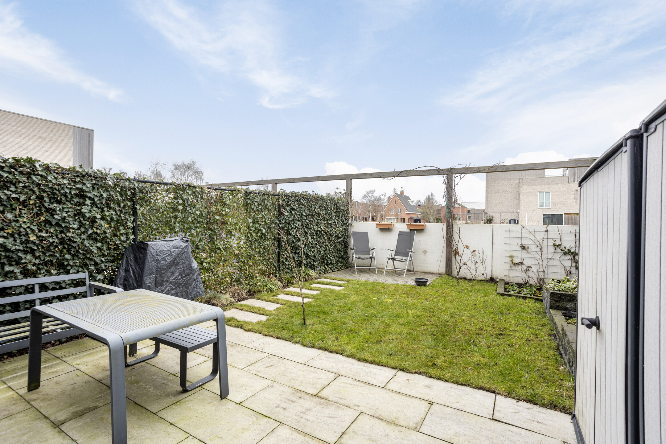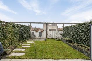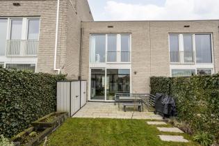 De onderhoudsvriendelijke achtertuin is gelegen op het noorden en biedt een prachtig vrij uitzicht over het aangrenzende groen. De tuin is ingericht met twee terrassen, vaste bloembakken en groene erfafscheidingen, wat zorgt voor een rustige en natuurlijke uitstraling.