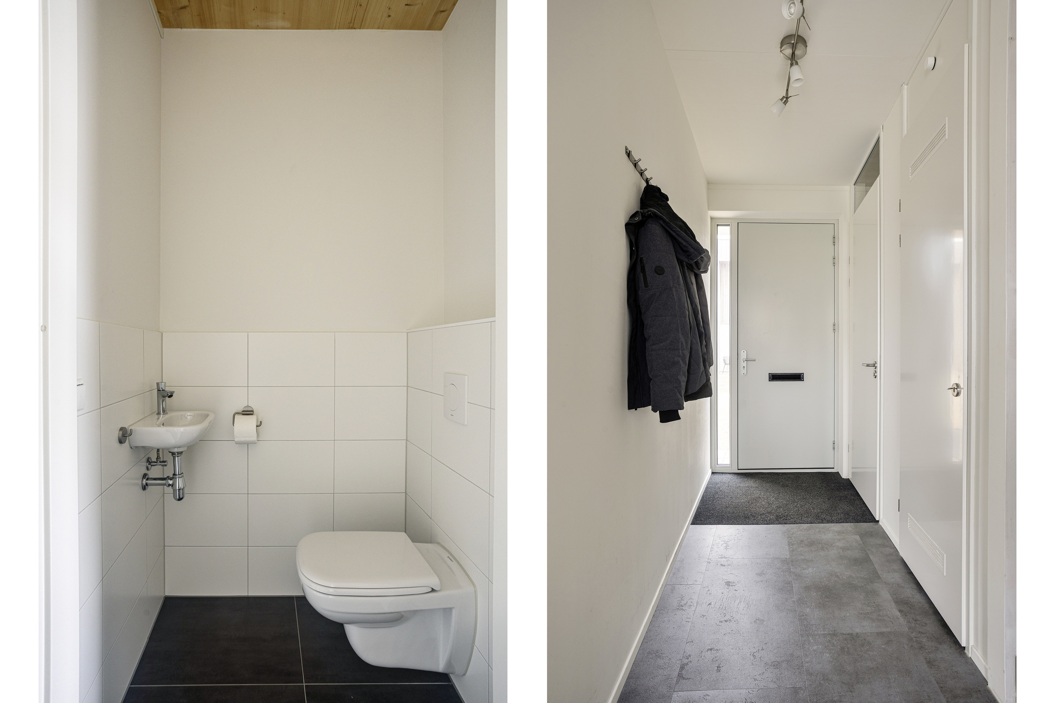 Via the entrance hall, finished with an attractive PVC floor, you reach the staircase and the extensive meter cupboard. The partially tiled toilet is fitted with a wall-mounted toilet and a washbasin.