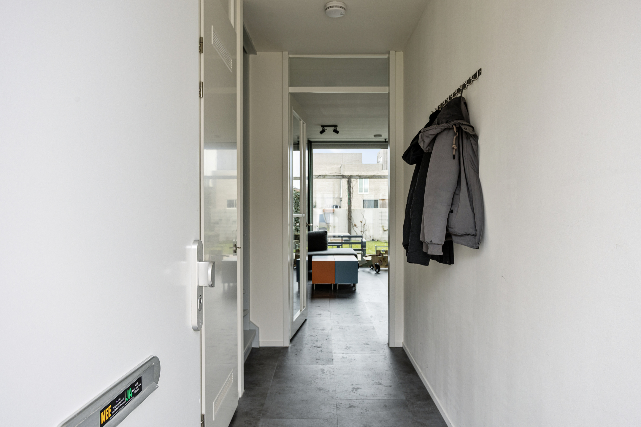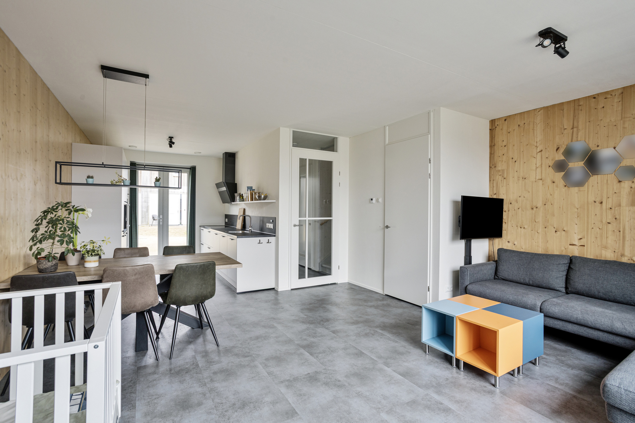 De sfeervolle woonkamer is afgewerkt met een pvc-vloer met vloerverwarming, een praktische trapkast en een schuifpui naar de achtertuin. Dankzij de ligging aan de achterzijde geniet u hier van veel privacy en een prettige lichtinval door de grote raampartijen.