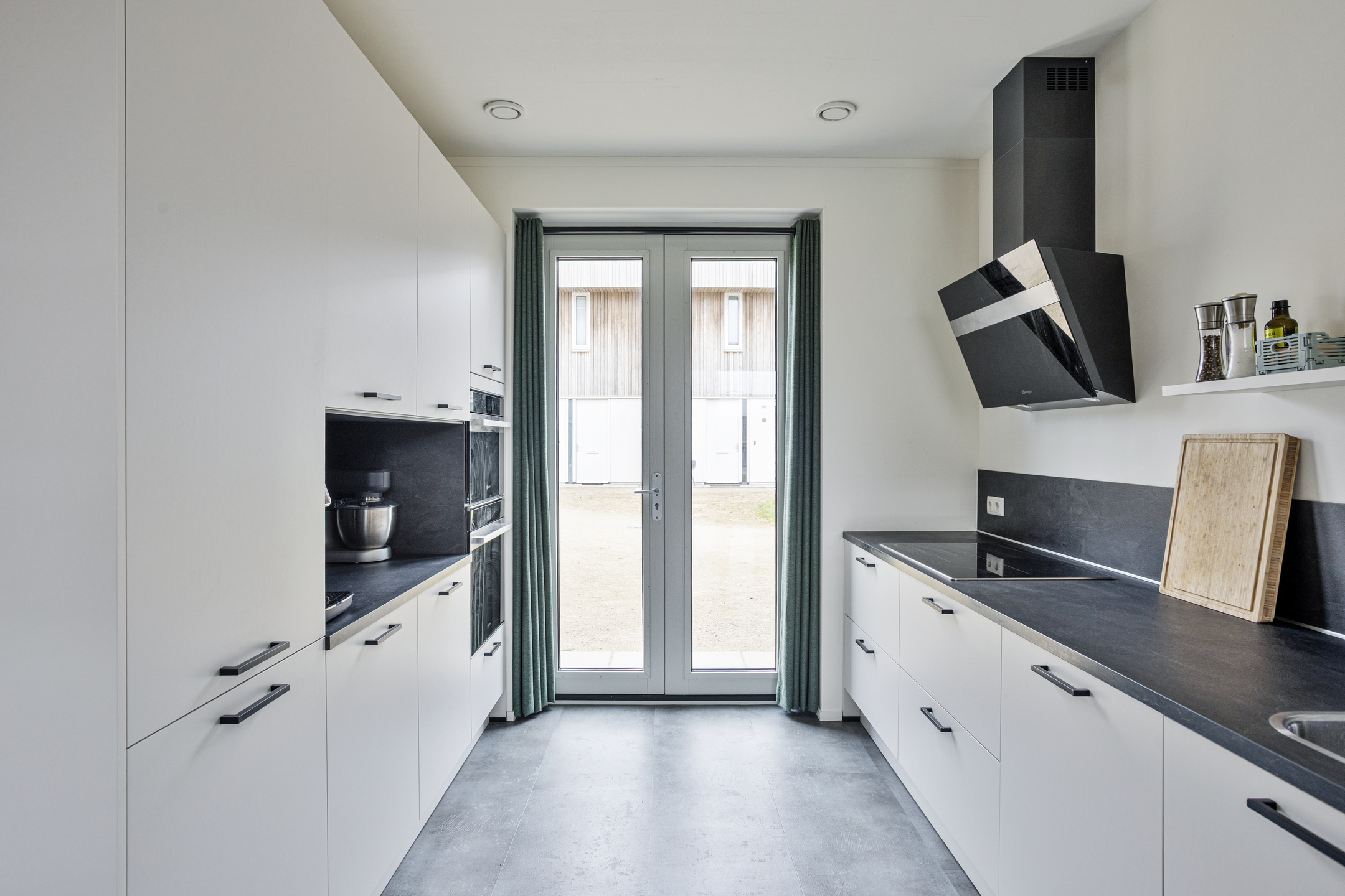 The modern open-plan kitchen is arranged in a double wall layout and equipped with high-quality built-in appliances, including an induction hob, extractor hood, sink, dishwasher, combi oven, and a separate oven. French doors provide a pleasant connection to the outdoor space.