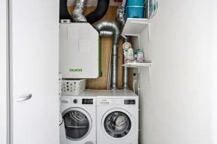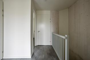 De overloop met laminaatvloer biedt toegang tot alle vertrekken op deze verdieping, waaronder drie slaapkamers, de badkamer en een aparte wasruimte. In de wasruimte is de WTW-installatie gesitueerd.