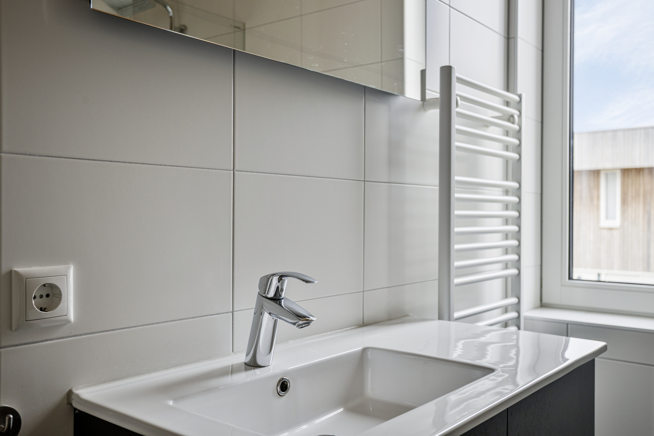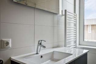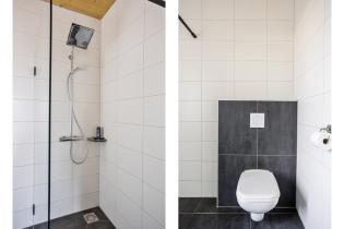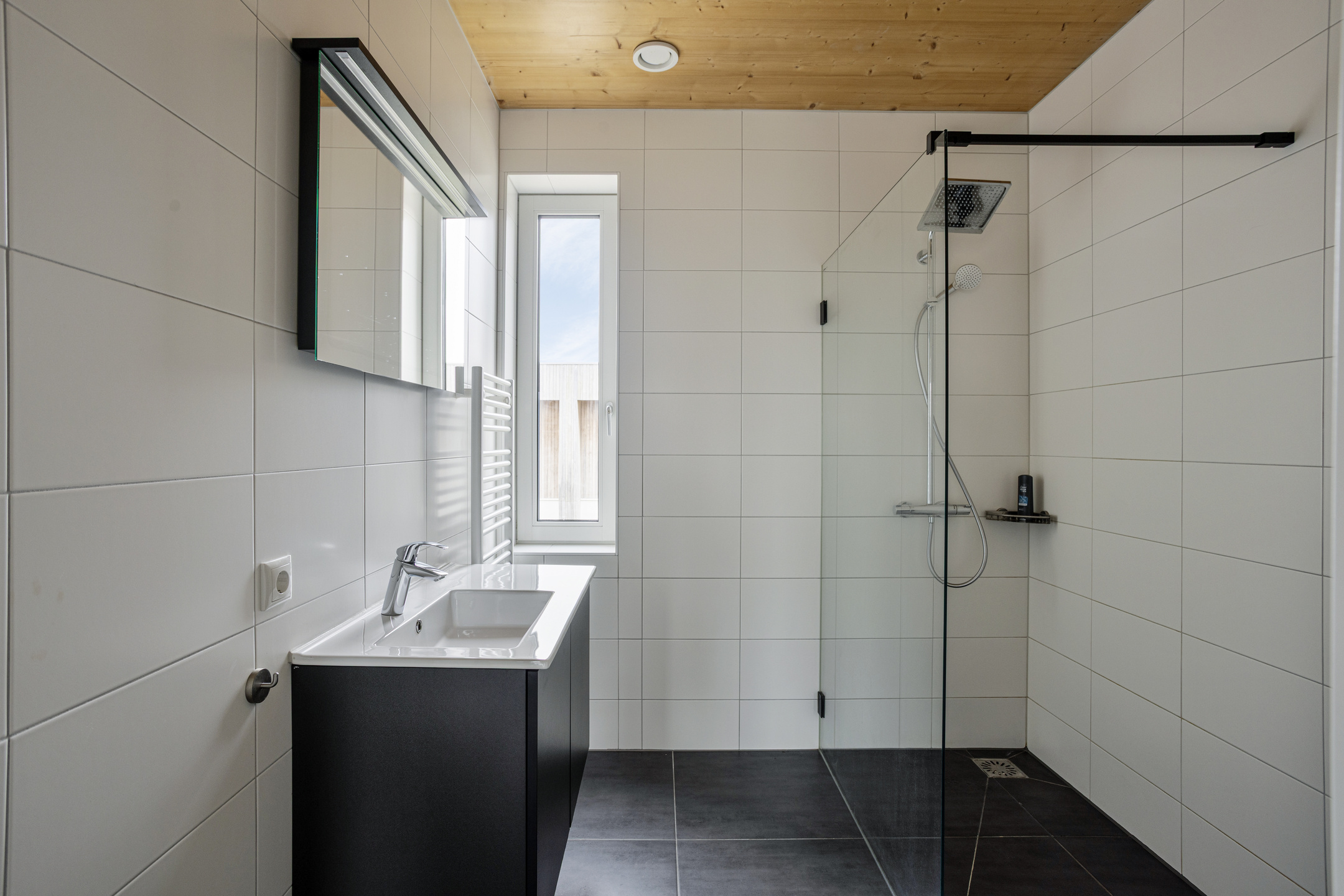 De volledig betegelde badkamer is modern uitgevoerd en voorzien van een inloopdouche, een zwevend toilet, een wastafelmeubel en een designradiator.
