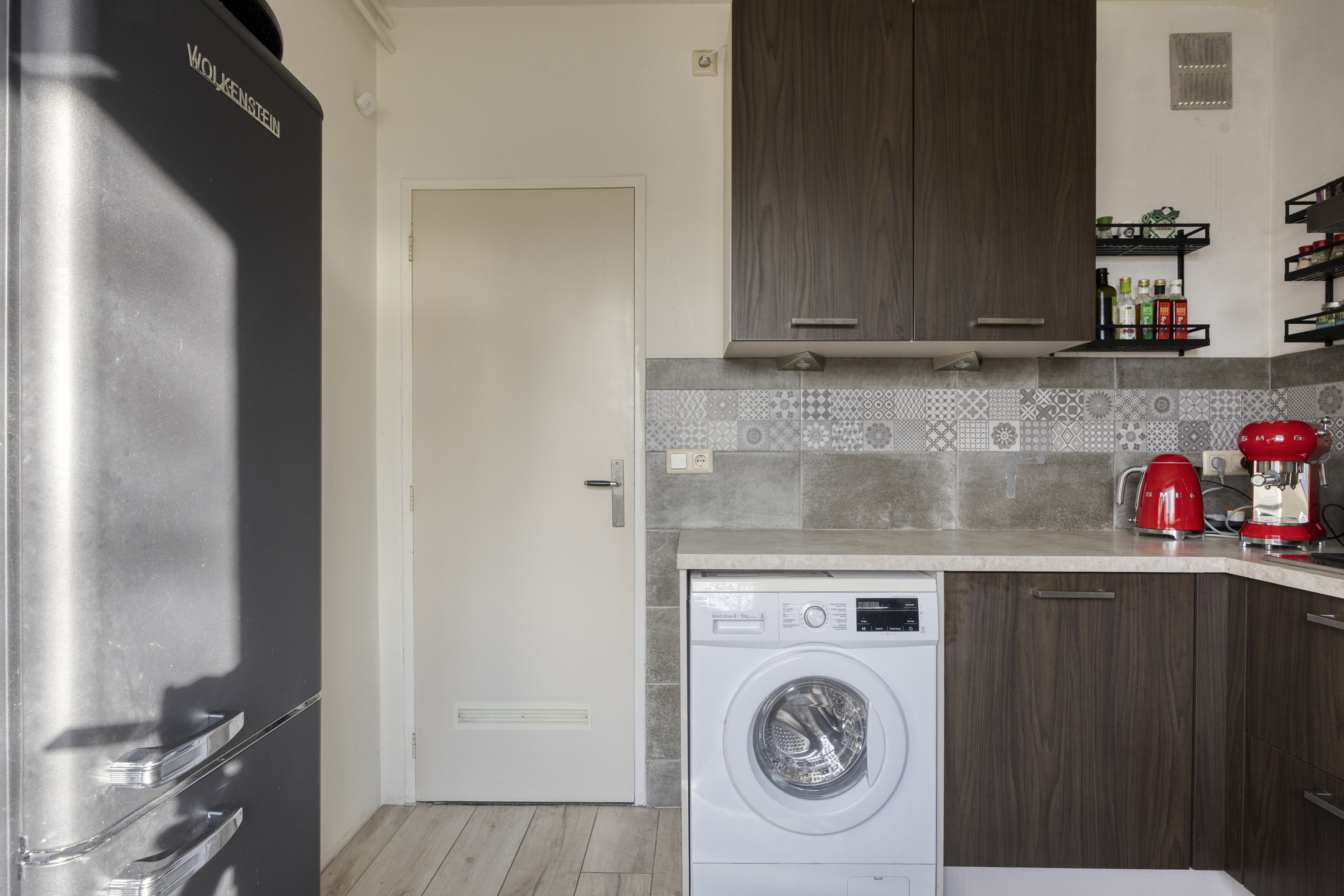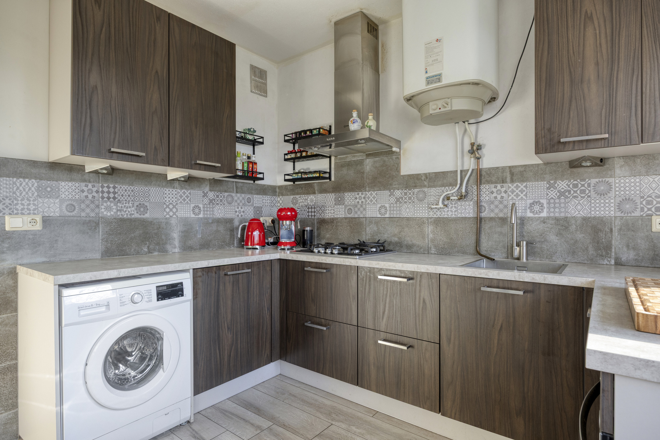 Aan de voorzijde bevindt zich de nette keuken in praktische hoekopstelling. Deze is voorzien van een 4-pits gaskookplaat, afzuigkap, oven, vaatwasser en een losse koelkast. Daarnaast vind je hier de aansluiting voor de wasmachine en een eigen boiler voor warm water.