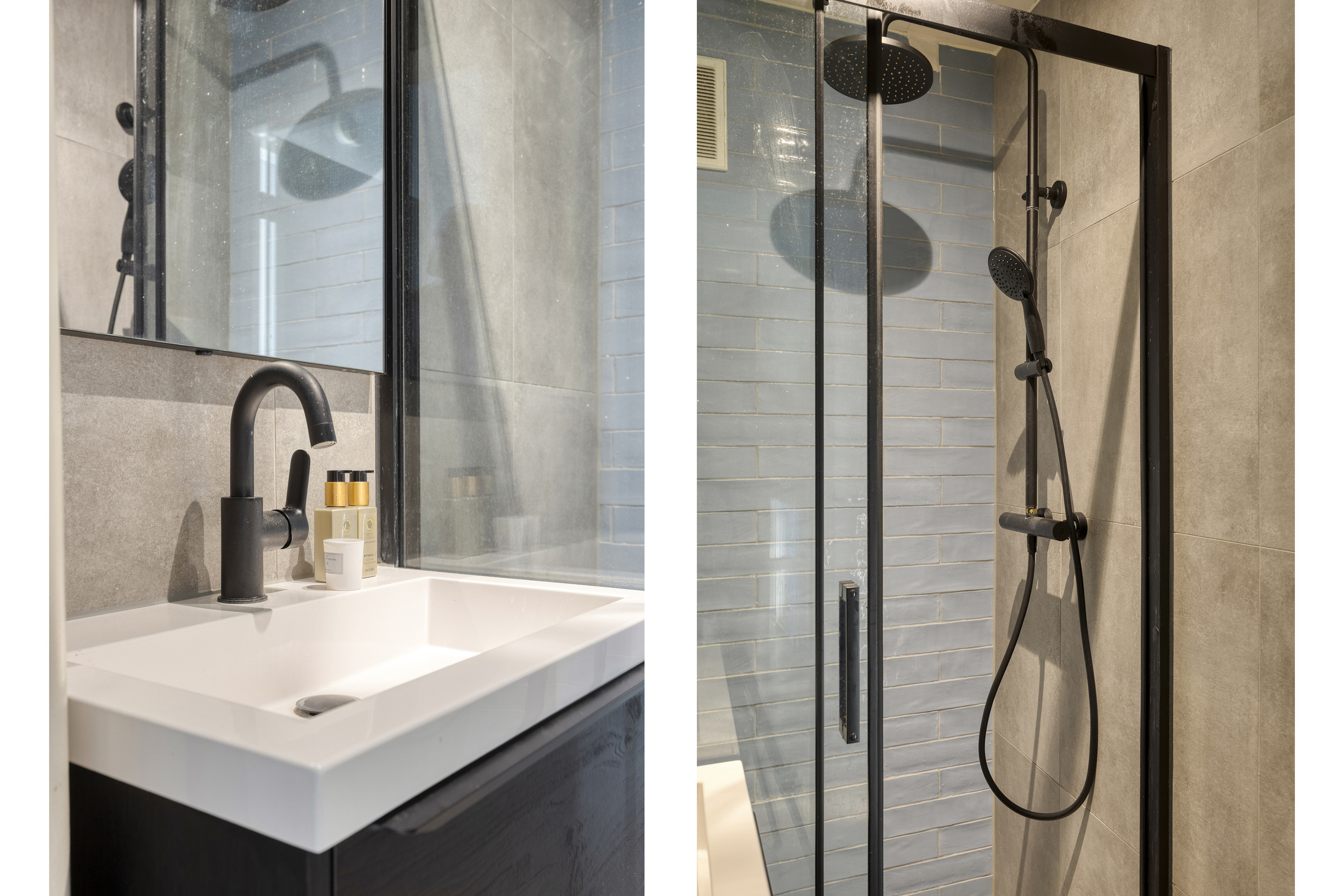 De moderne badkamer is centraal in het appartement gesitueerd, volledig betegeld en uitgerust met een douche en een wastafelmeubel. Het separate toilet is eveneens betegeld en voorzien van een hangend closet.