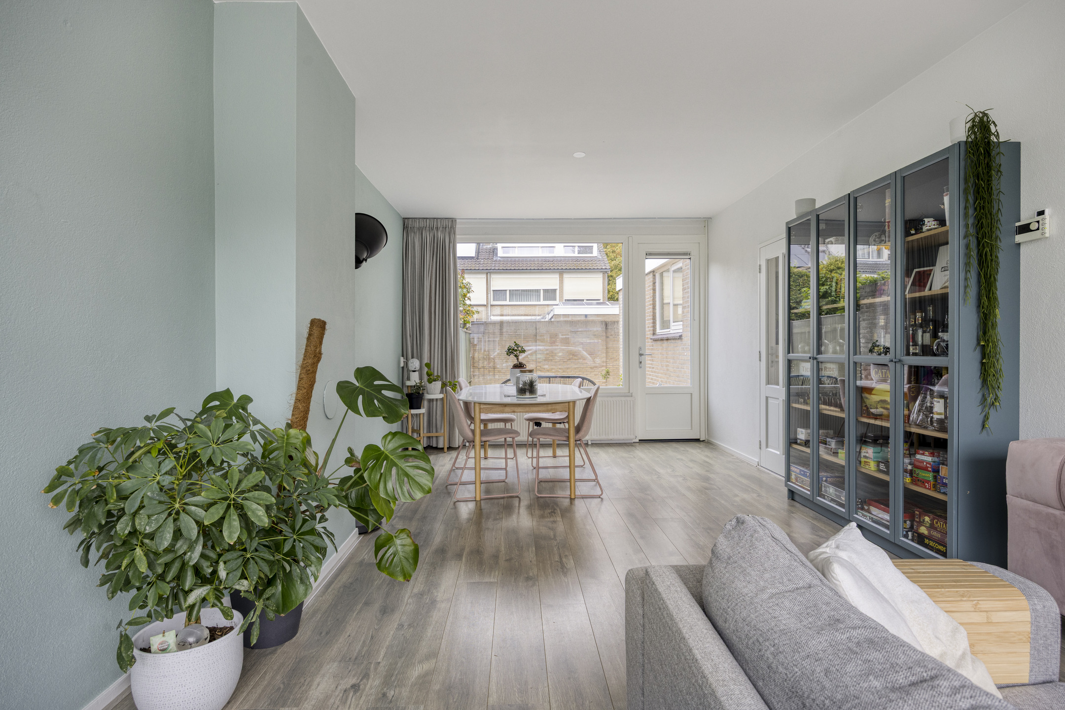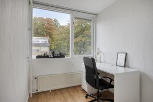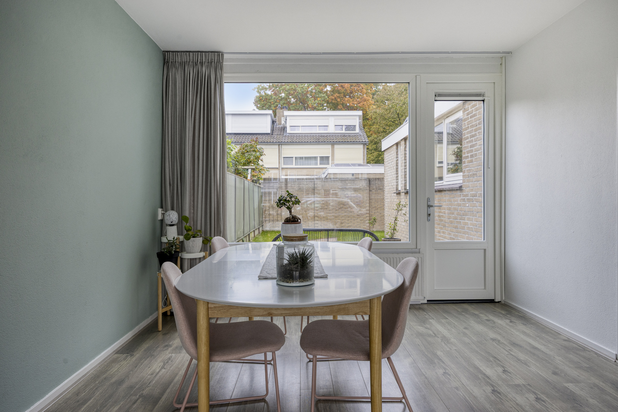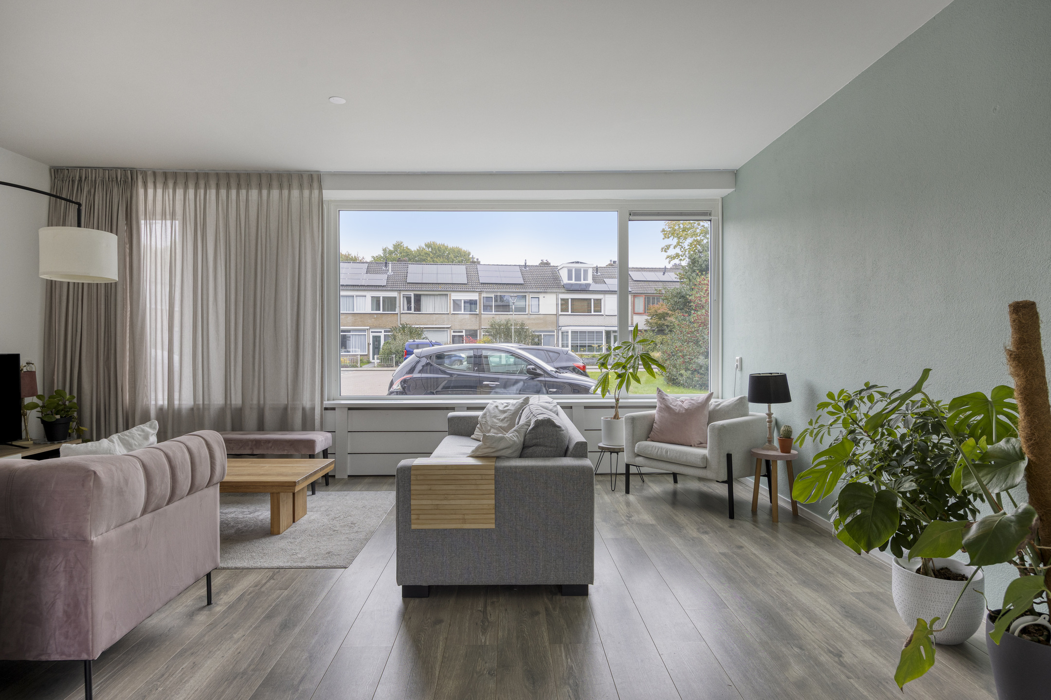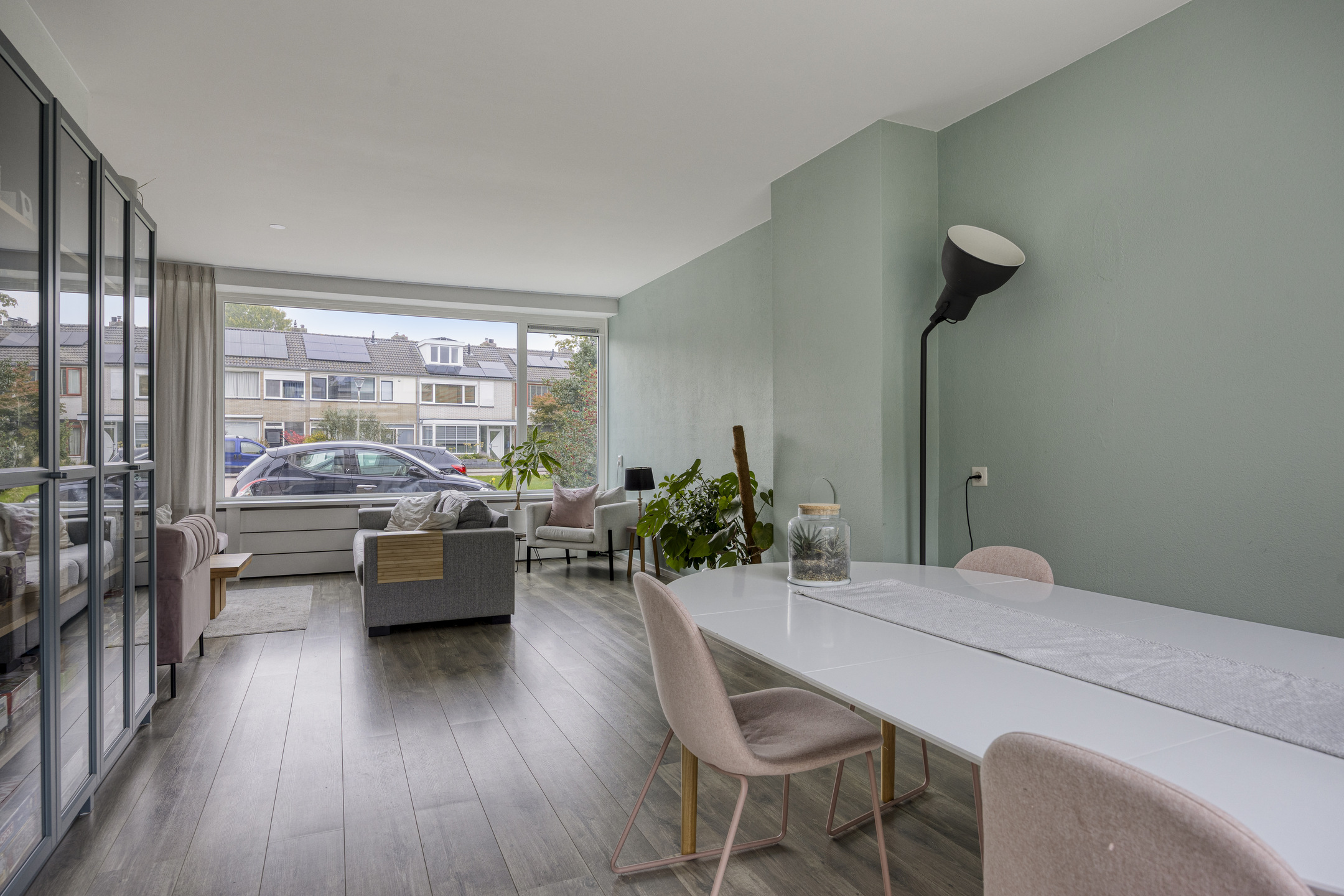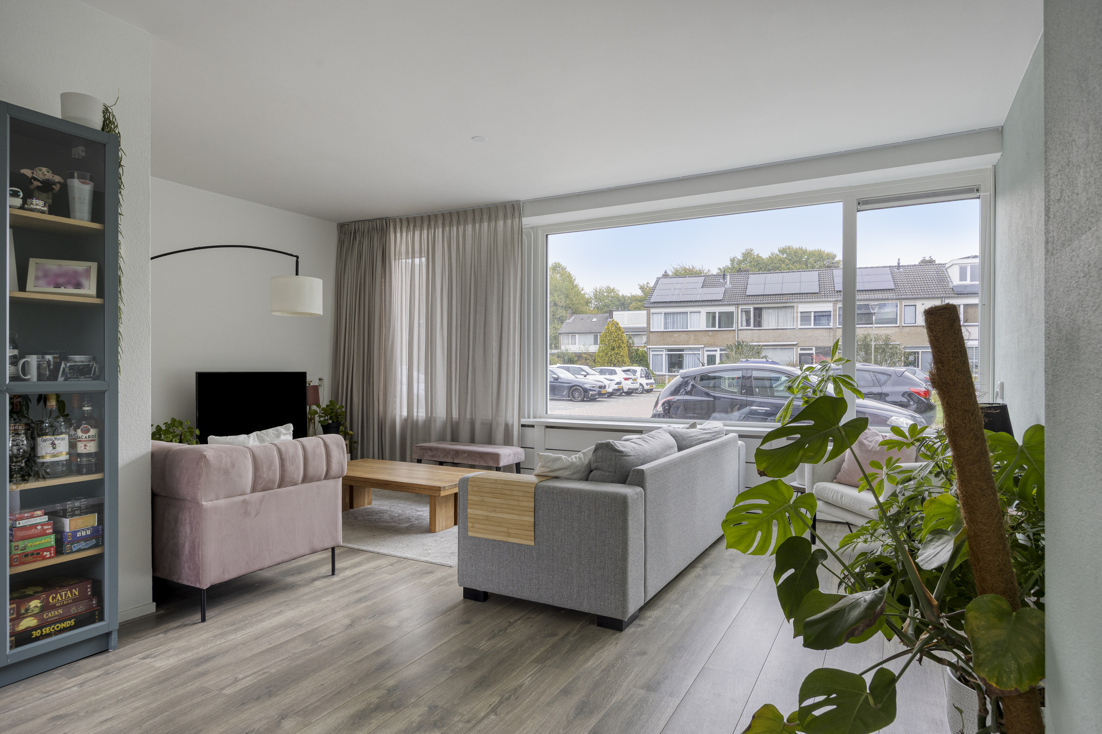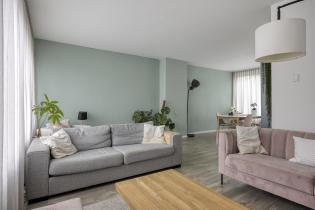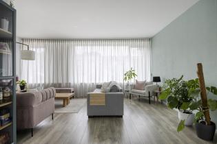 De royale, lichte L-vormige woonkamer (ca. 34 m²) heeft een prettig uitzicht op het groene hofje aan de voorzijde. De ruimte is afgewerkt met glad stucwerk op wanden en plafond en een lichte laminaatvloer. De vernieuwde kunststofkozijnen met triple glas zorgen voor uitstekende isolatie en extra wooncomfort.