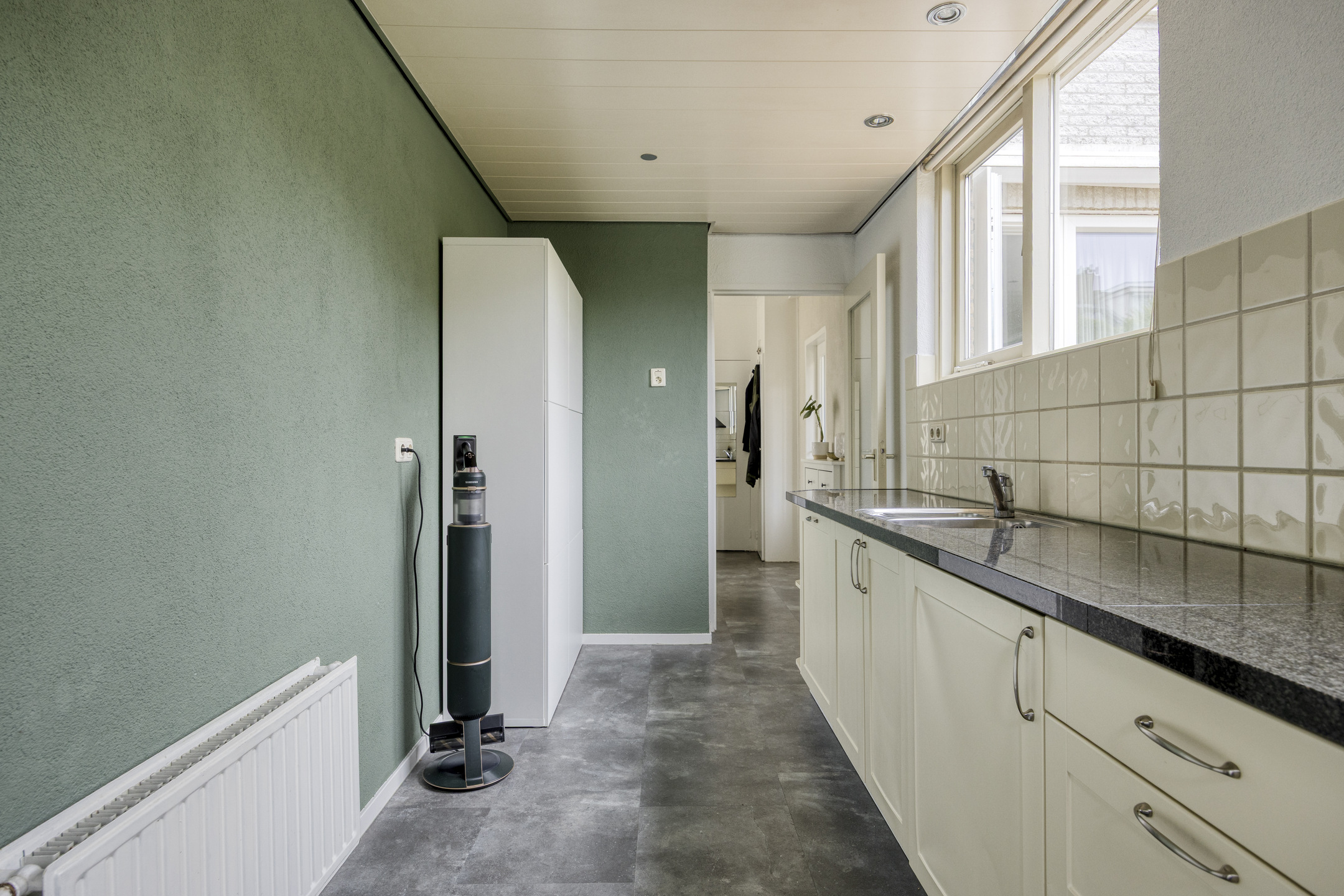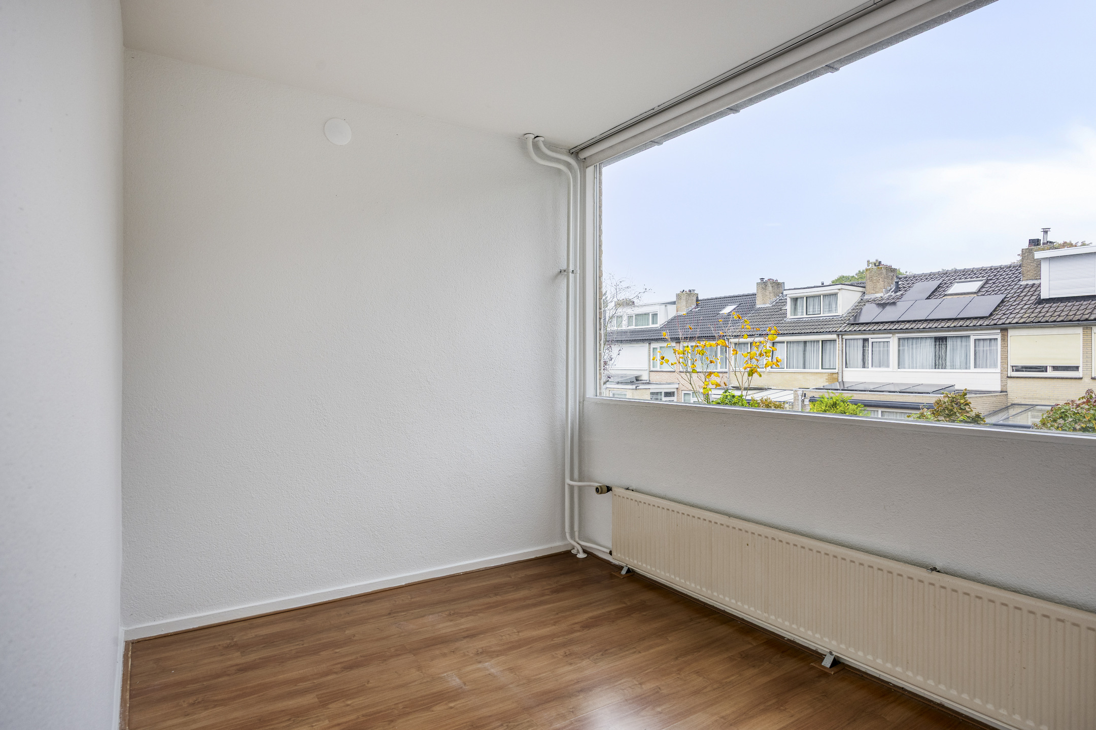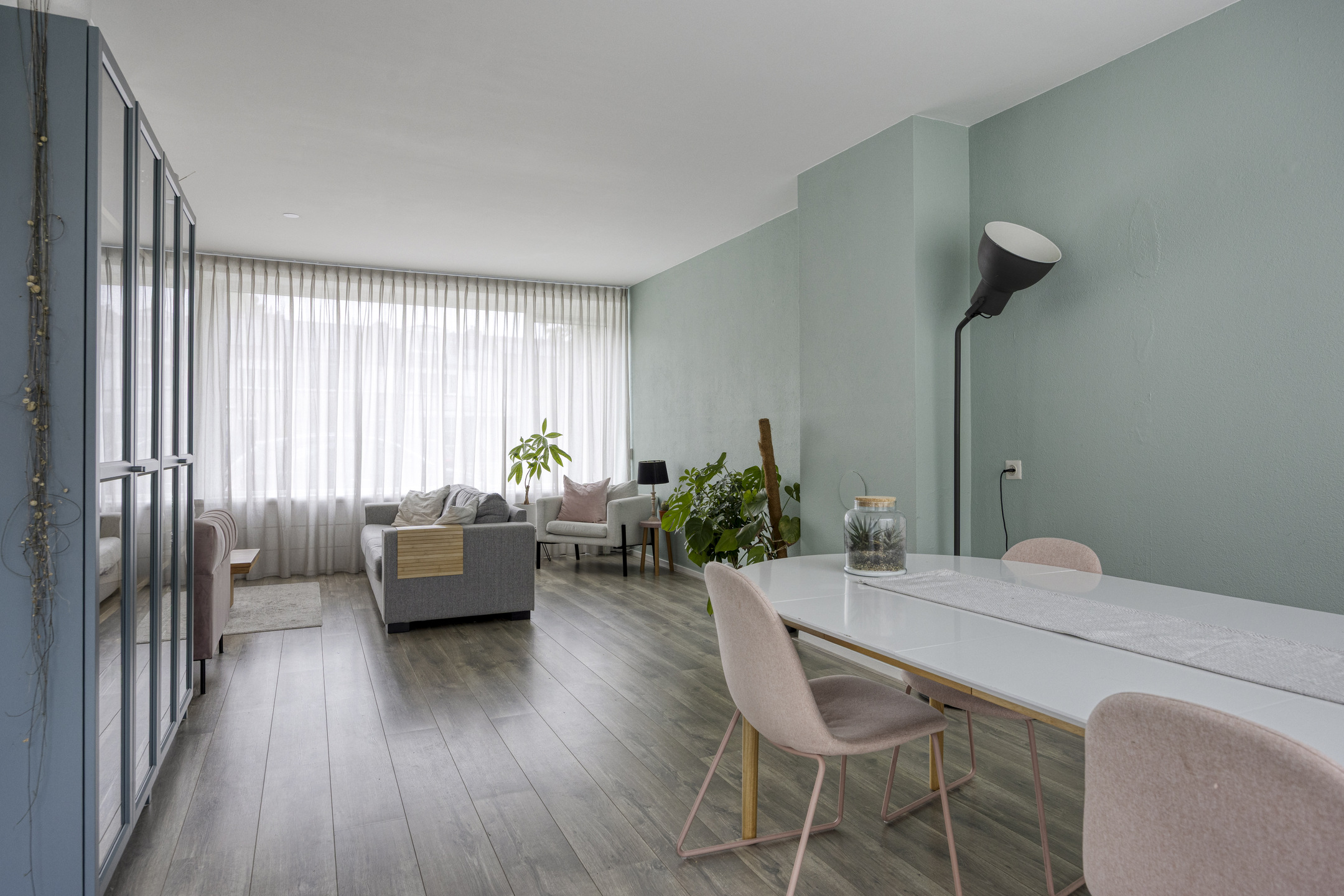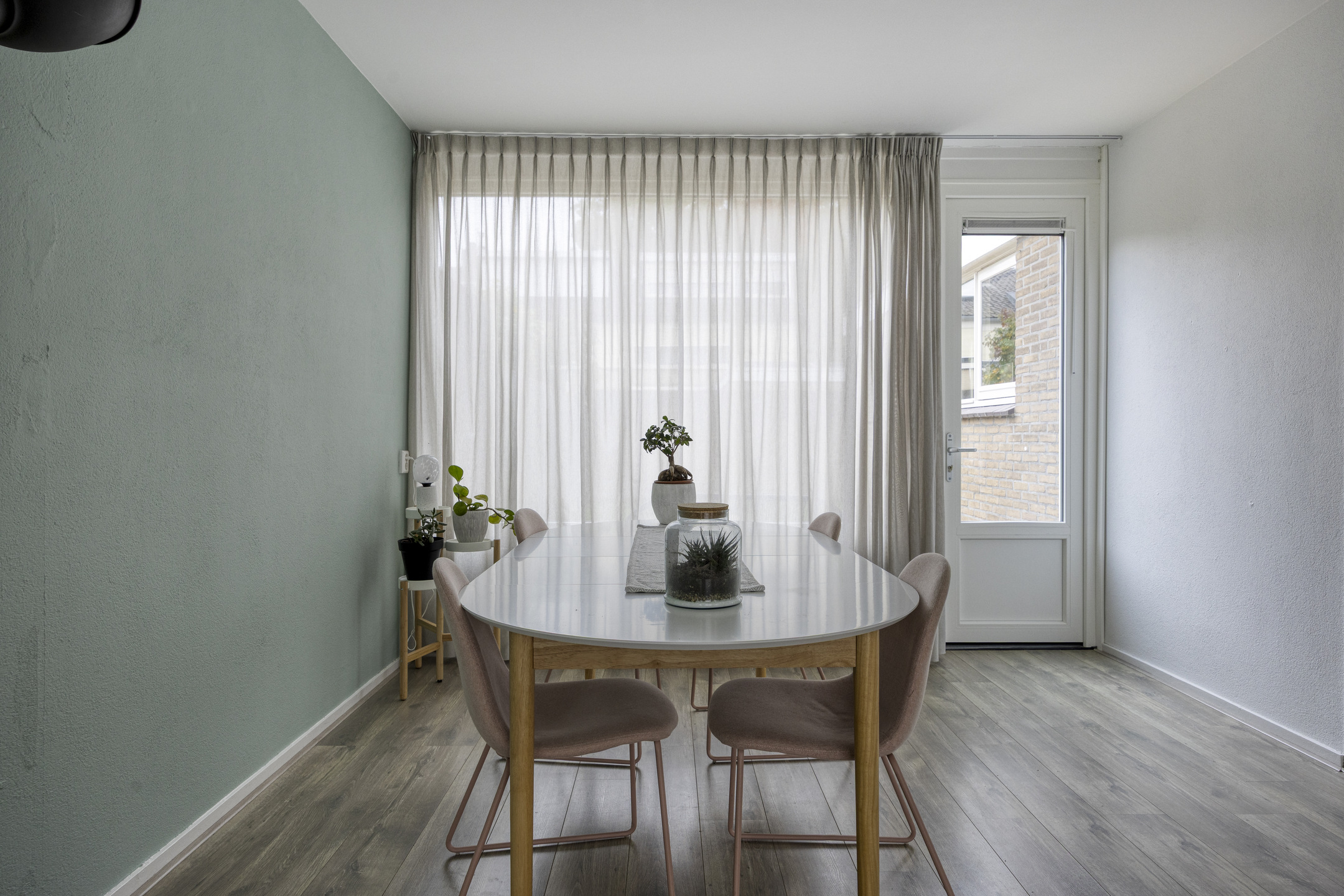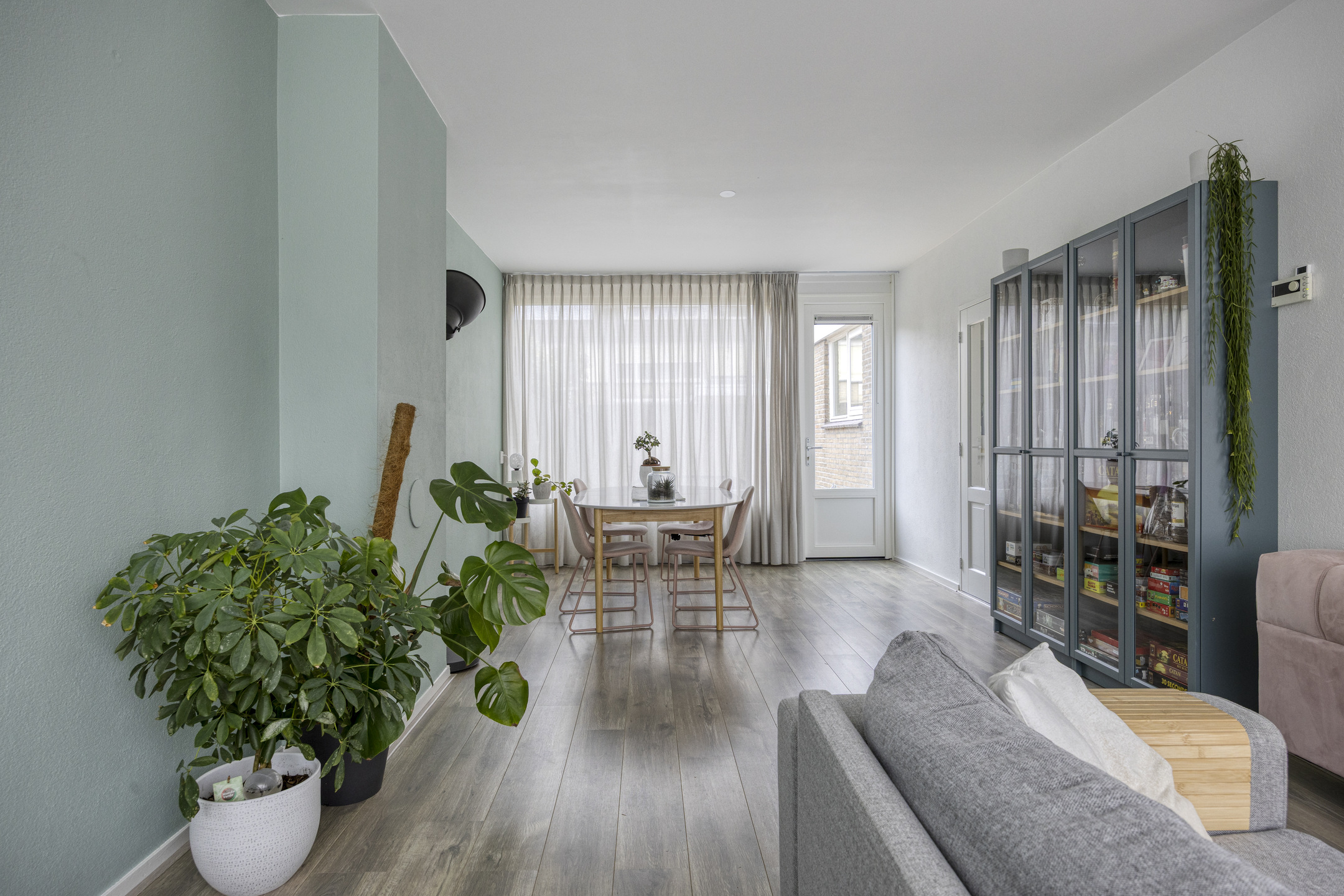 De royale, lichte L-vormige woonkamer (ca. 34 m²) heeft een prettig uitzicht op het groene hofje aan de voorzijde. De ruimte is afgewerkt met glad stucwerk op wanden en plafond en een lichte laminaatvloer. De vernieuwde kunststofkozijnen met triple glas zorgen voor uitstekende isolatie en extra wooncomfort.