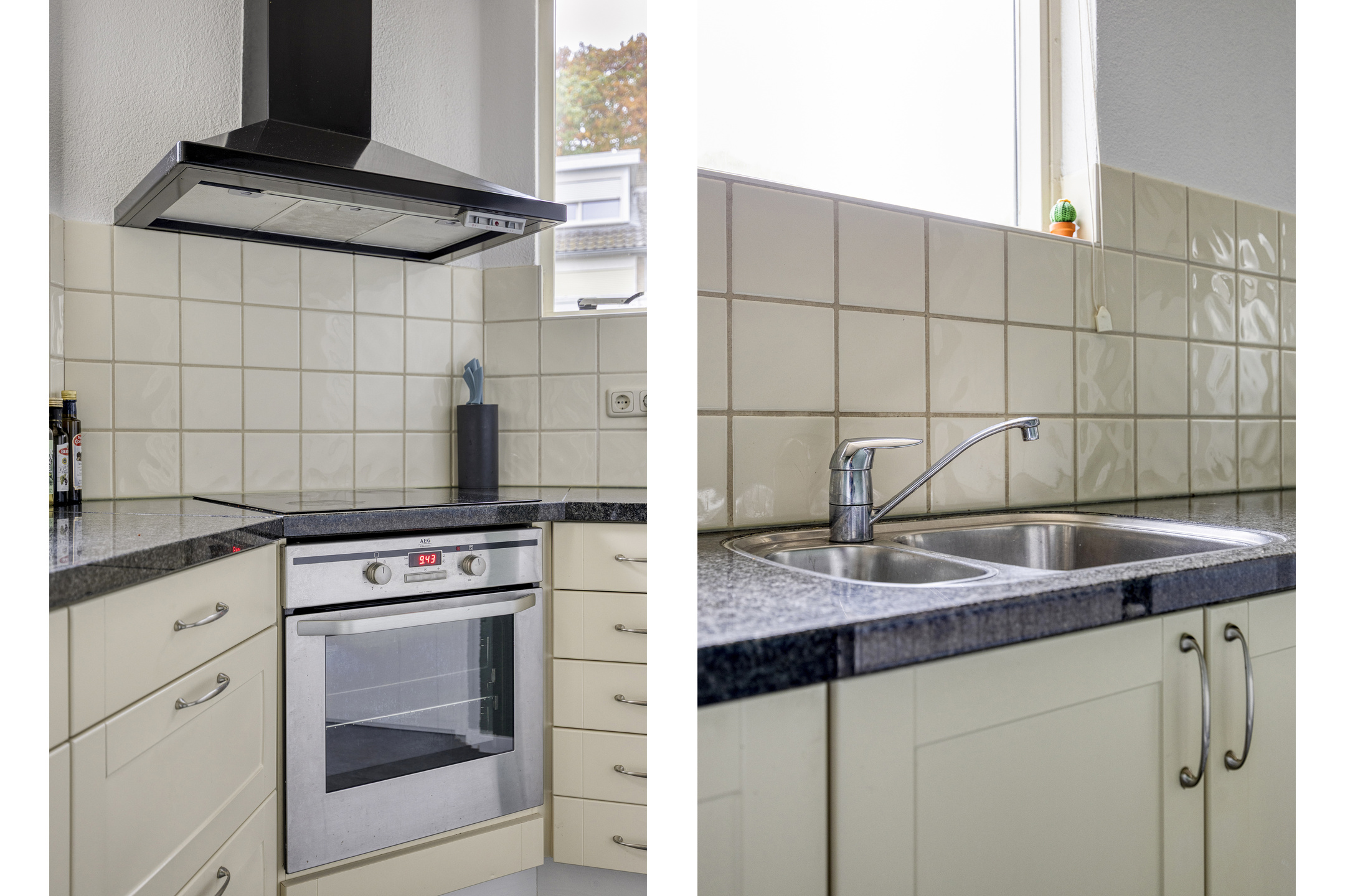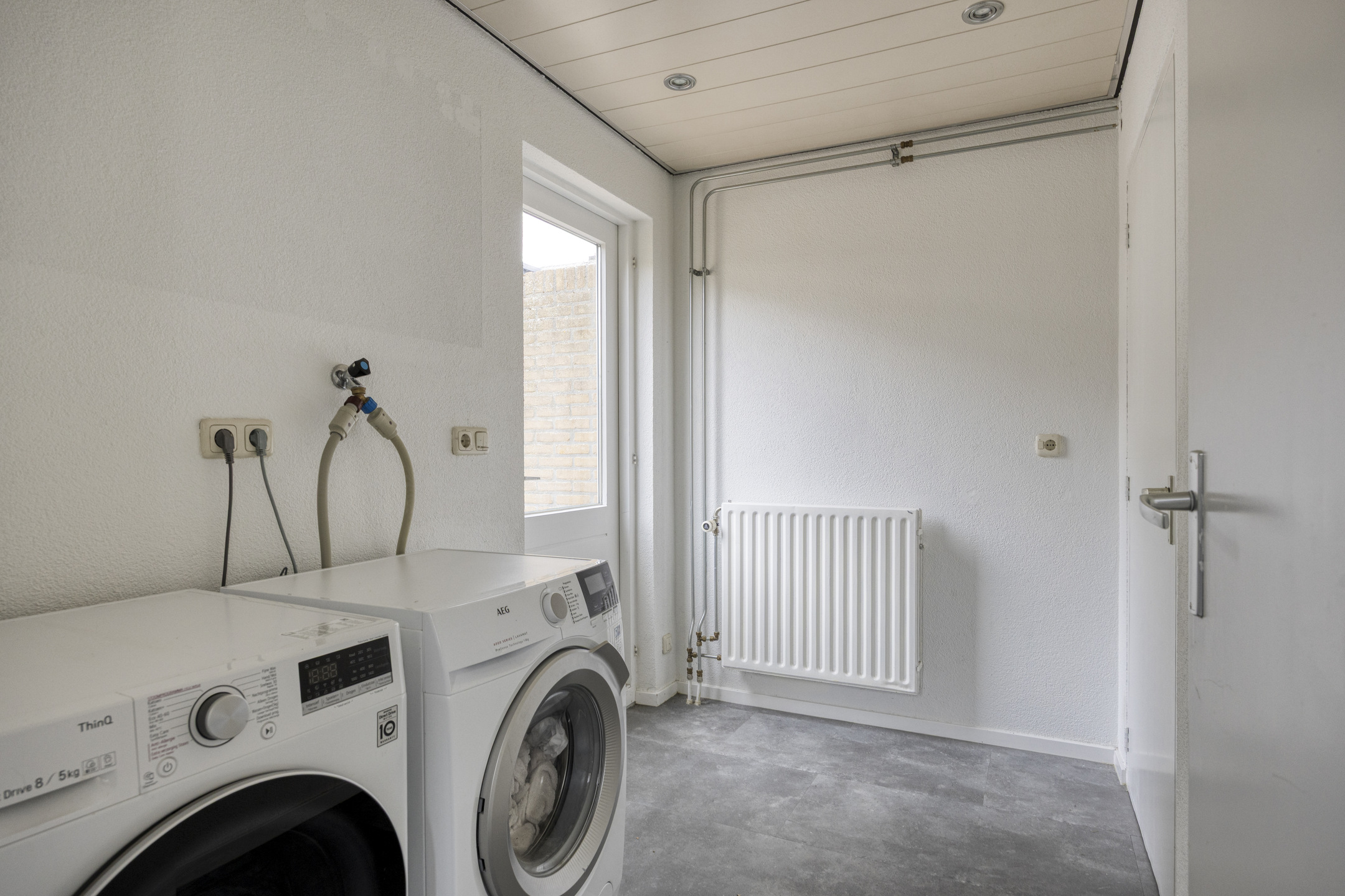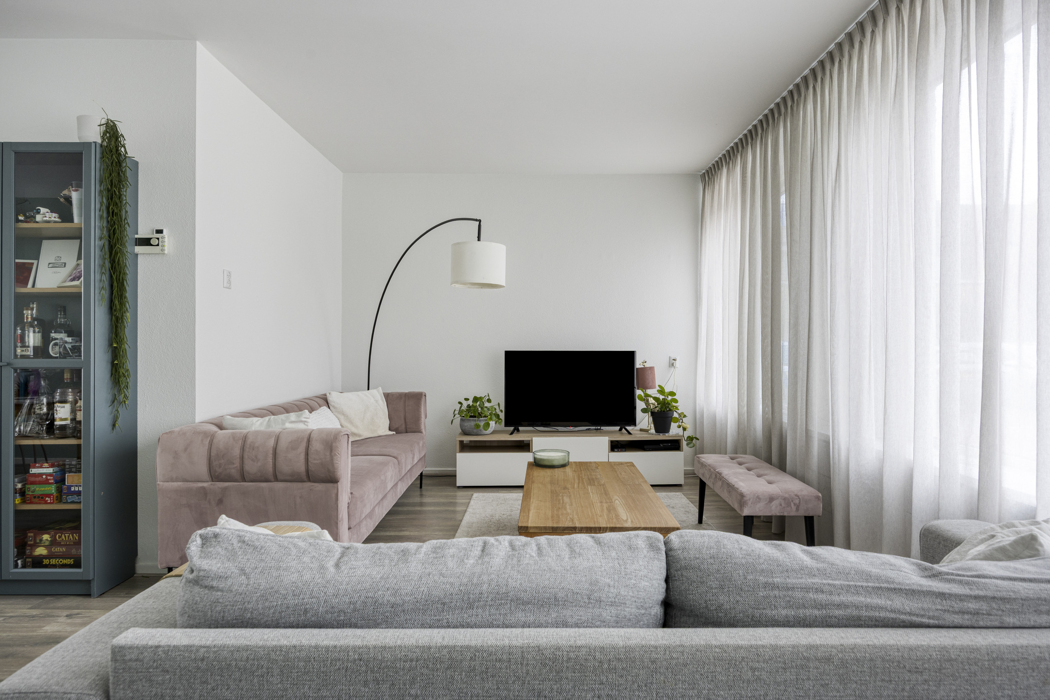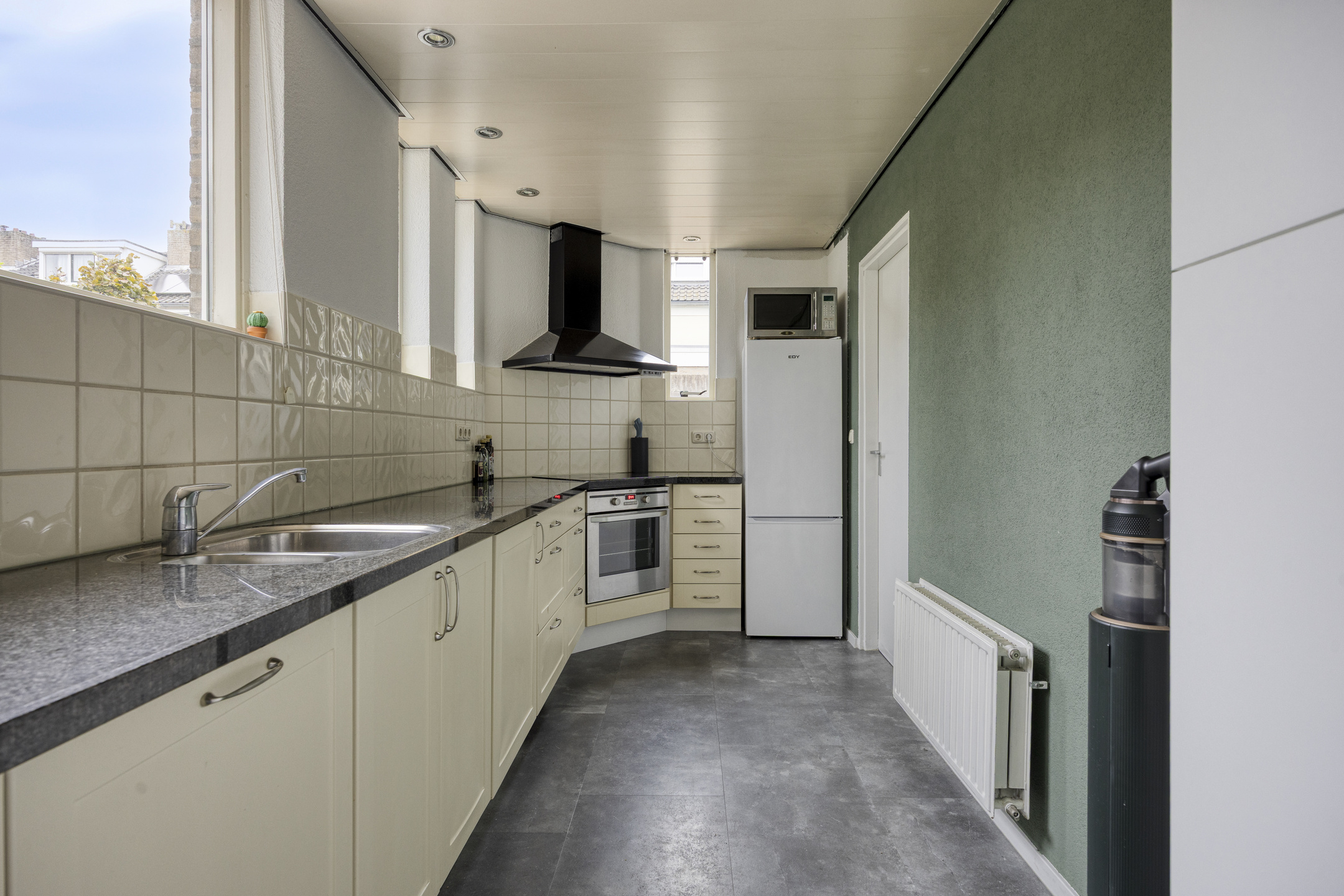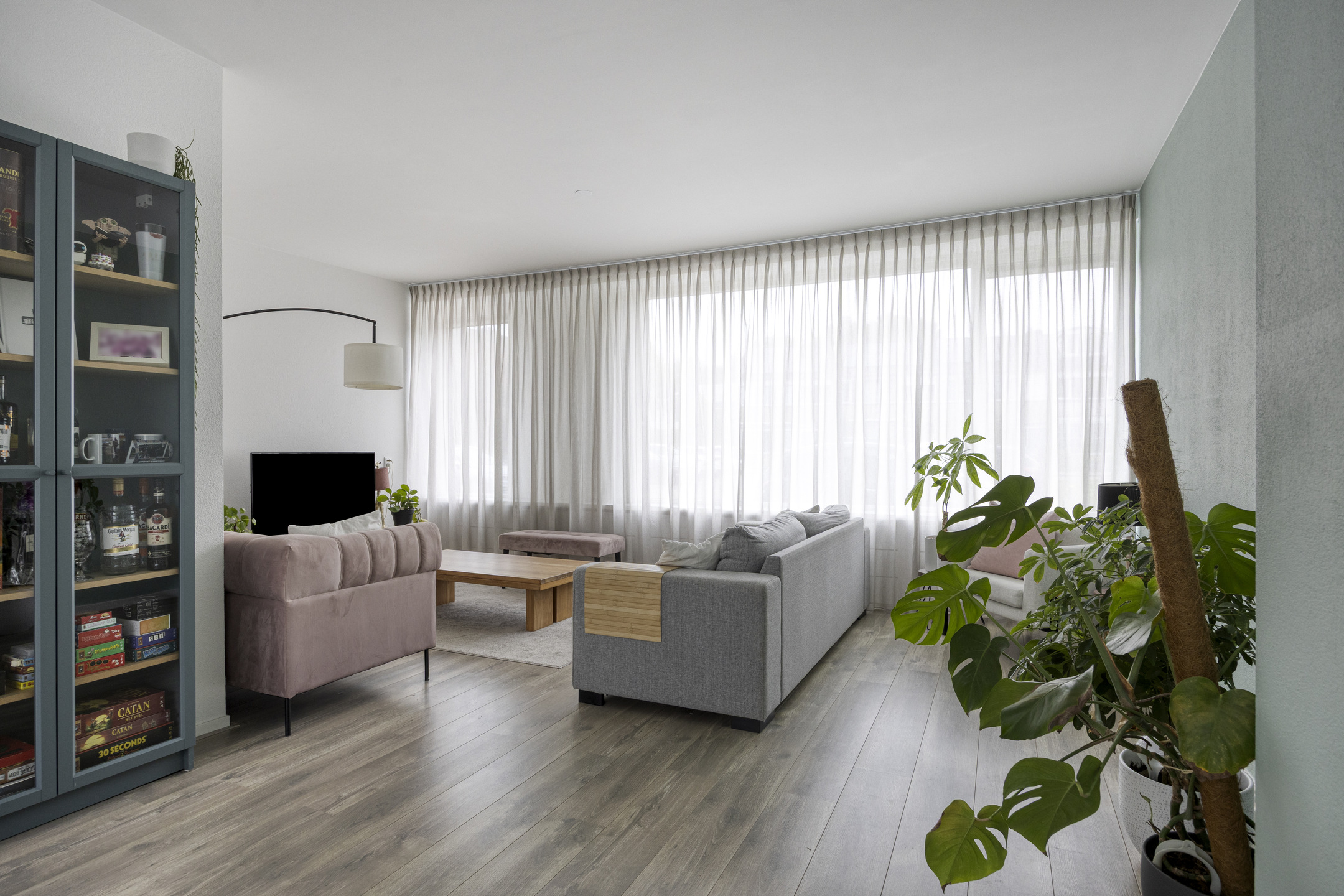 De royale, lichte L-vormige woonkamer (ca. 34 m²) heeft een prettig uitzicht op het groene hofje aan de voorzijde. De ruimte is afgewerkt met glad stucwerk op wanden en plafond en een lichte laminaatvloer. De vernieuwde kunststofkozijnen met triple glas zorgen voor uitstekende isolatie en extra wooncomfort.