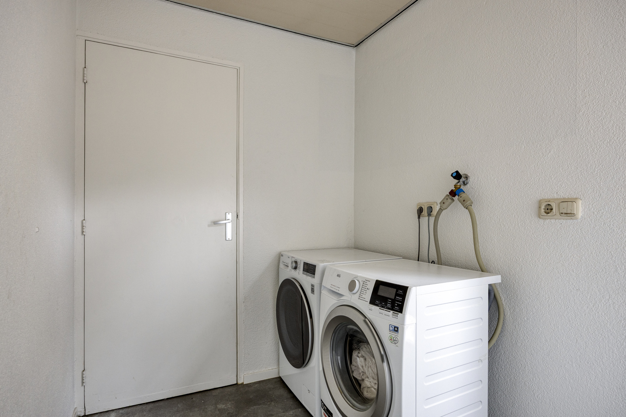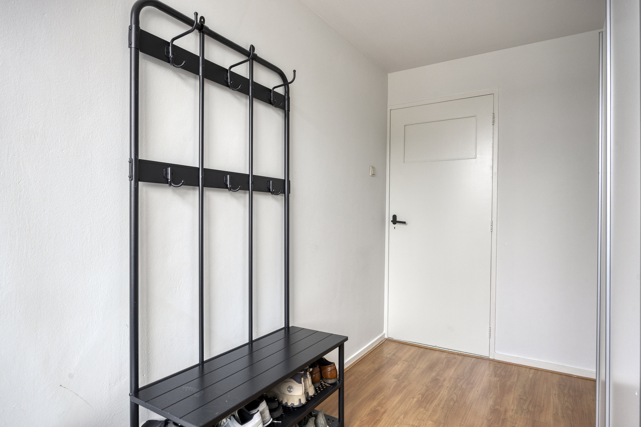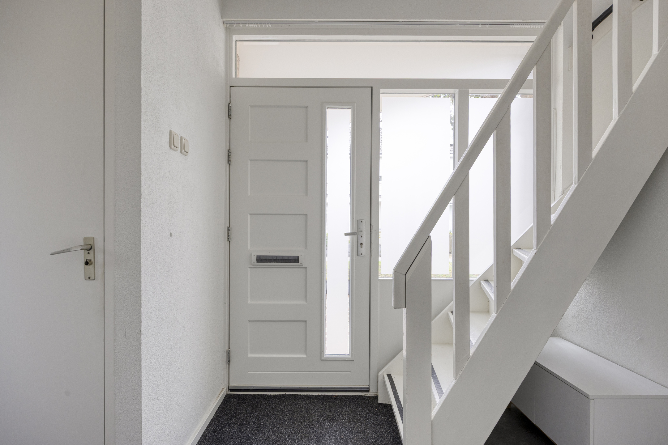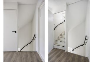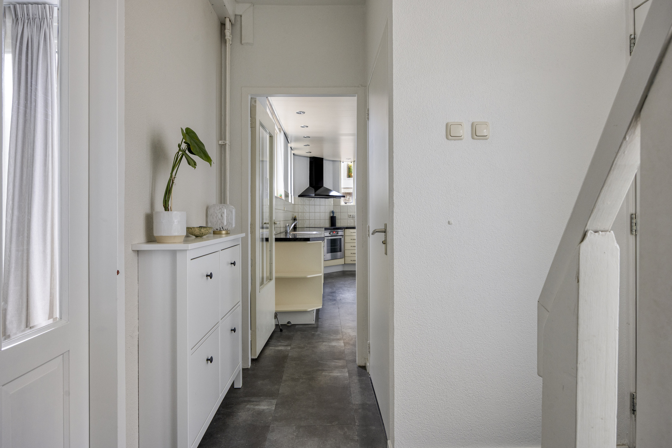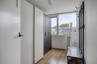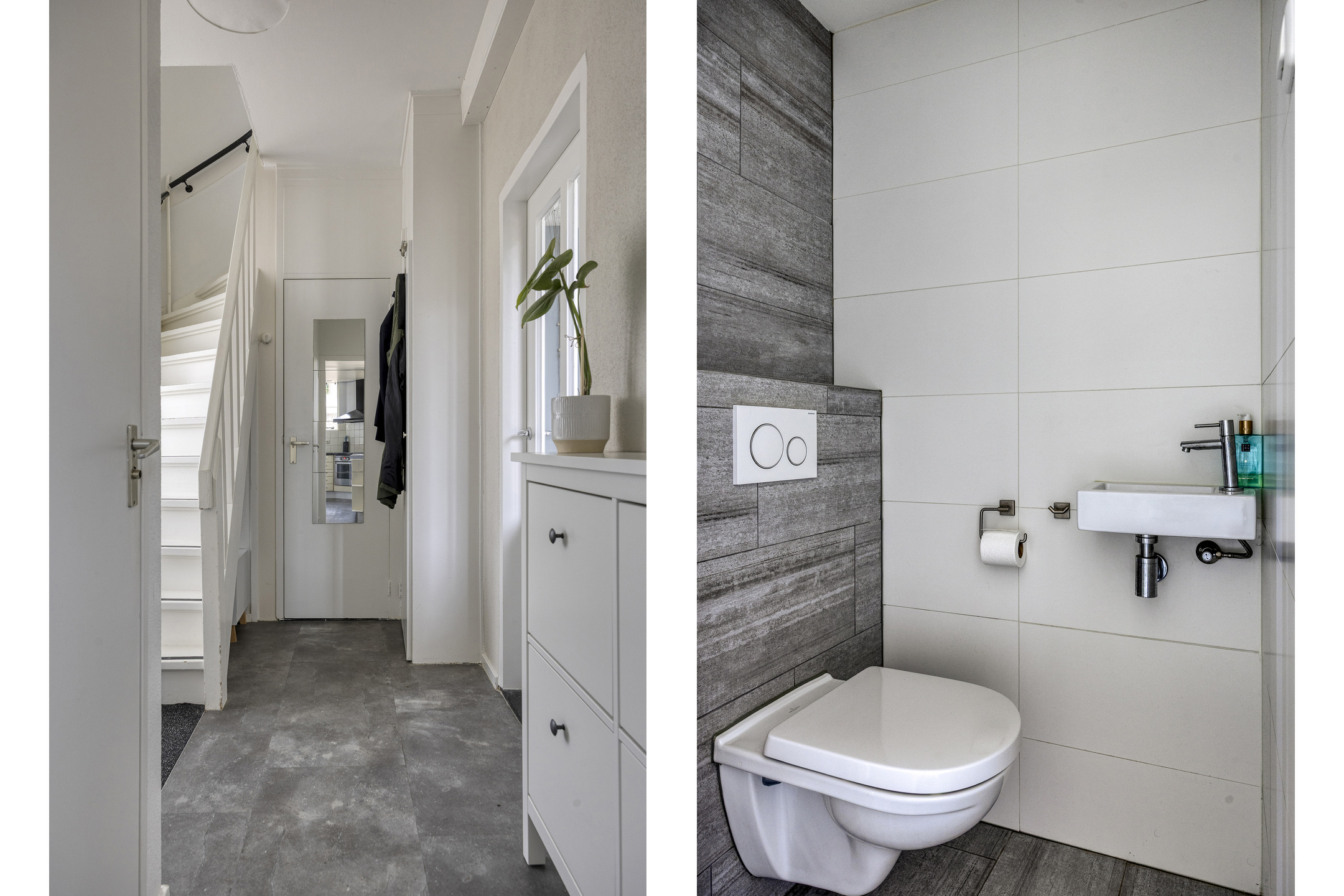 Via de entree kom je in de hal met garderobe, trapkast, meterkast en een modern toilet met hangend closet en fontein. Vanuit hier is zowel de woonkamer als de keuken bereikbaar.