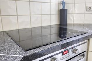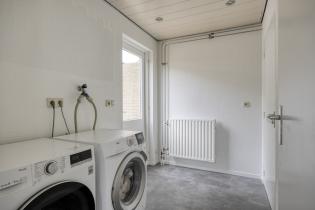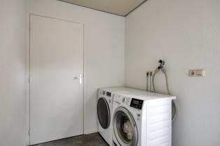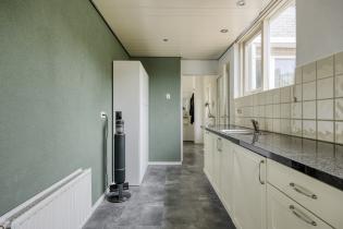 Aan de achterzijde bevindt zich de ruime keuken, gesitueerd in de uitbouw, met doorgang naar de bijkeuken en de inpandig bereikbare garage. De keuken in hoekopstelling is voorzien van een granieten werkblad, veel bergruimte en moderne inbouwapparatuur zoals een inductiekookplaat, oven en vaatwasser. De fraaie pvc-vloer loopt door in de praktische bijkeuken, waar ook de aansluitingen voor wasmachine en droger te vinden zijn. Vanuit hier en de woonkamer is er directe toegang tot de tuin. De garage is gedeeltelijk geïsoleerd en voorzien van dubbele deuren.