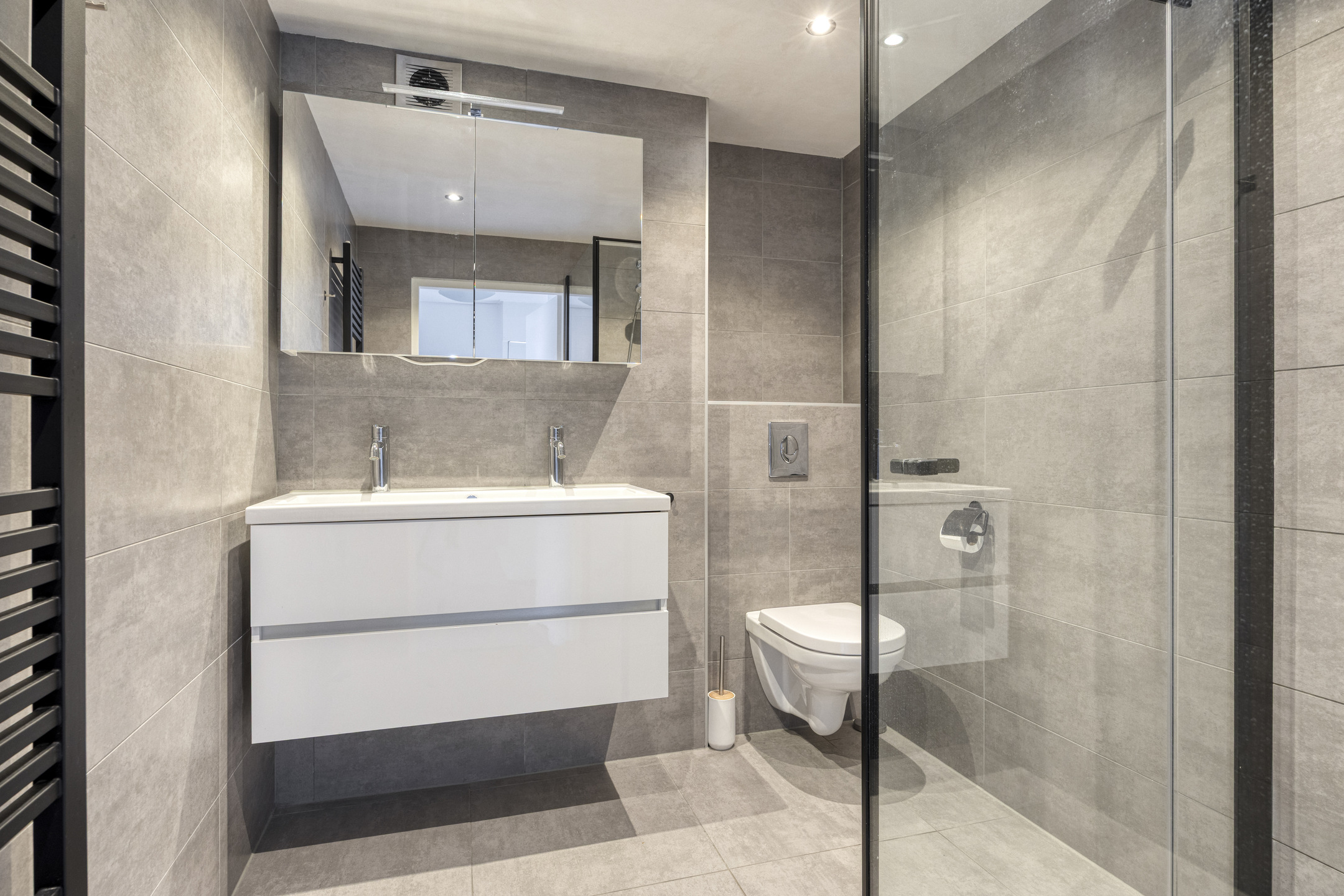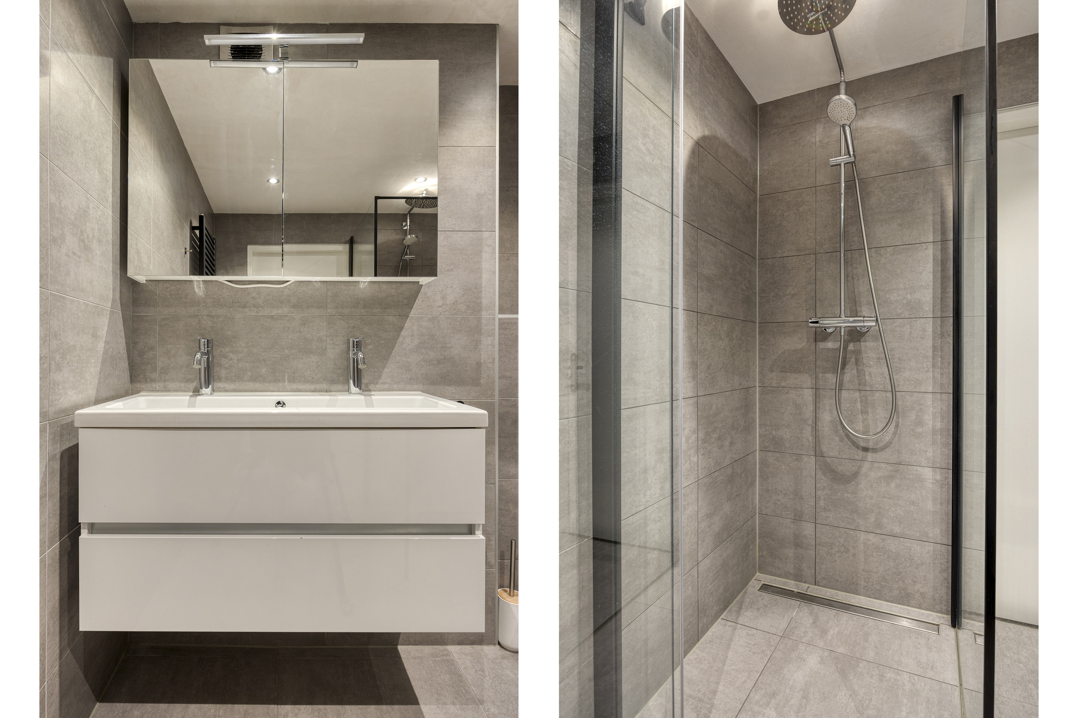 De badkamer is in 2021 vernieuwd en geheel betegeld. Deze moderne ruimte is voorzien van een inloopdouche, 2e toilet (sanibroyeur) en een dubbele wastafel met fraai meubel.
