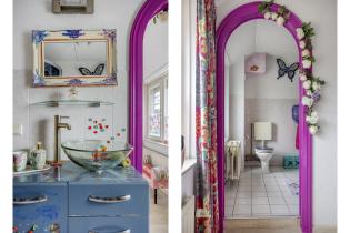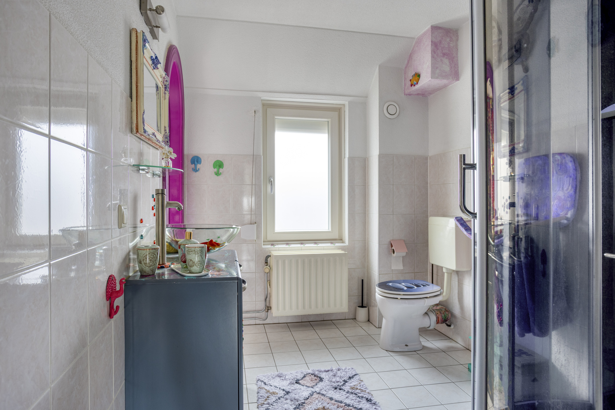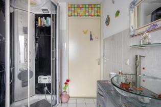De badkamer is deels betegeld en voorzien van een douchecabine, staand toilet en wastafelmeubel.