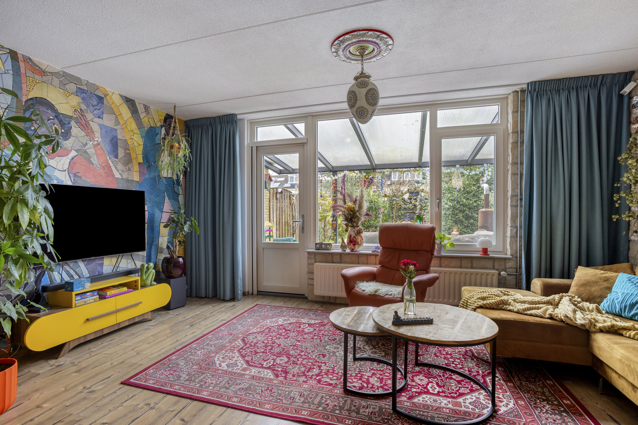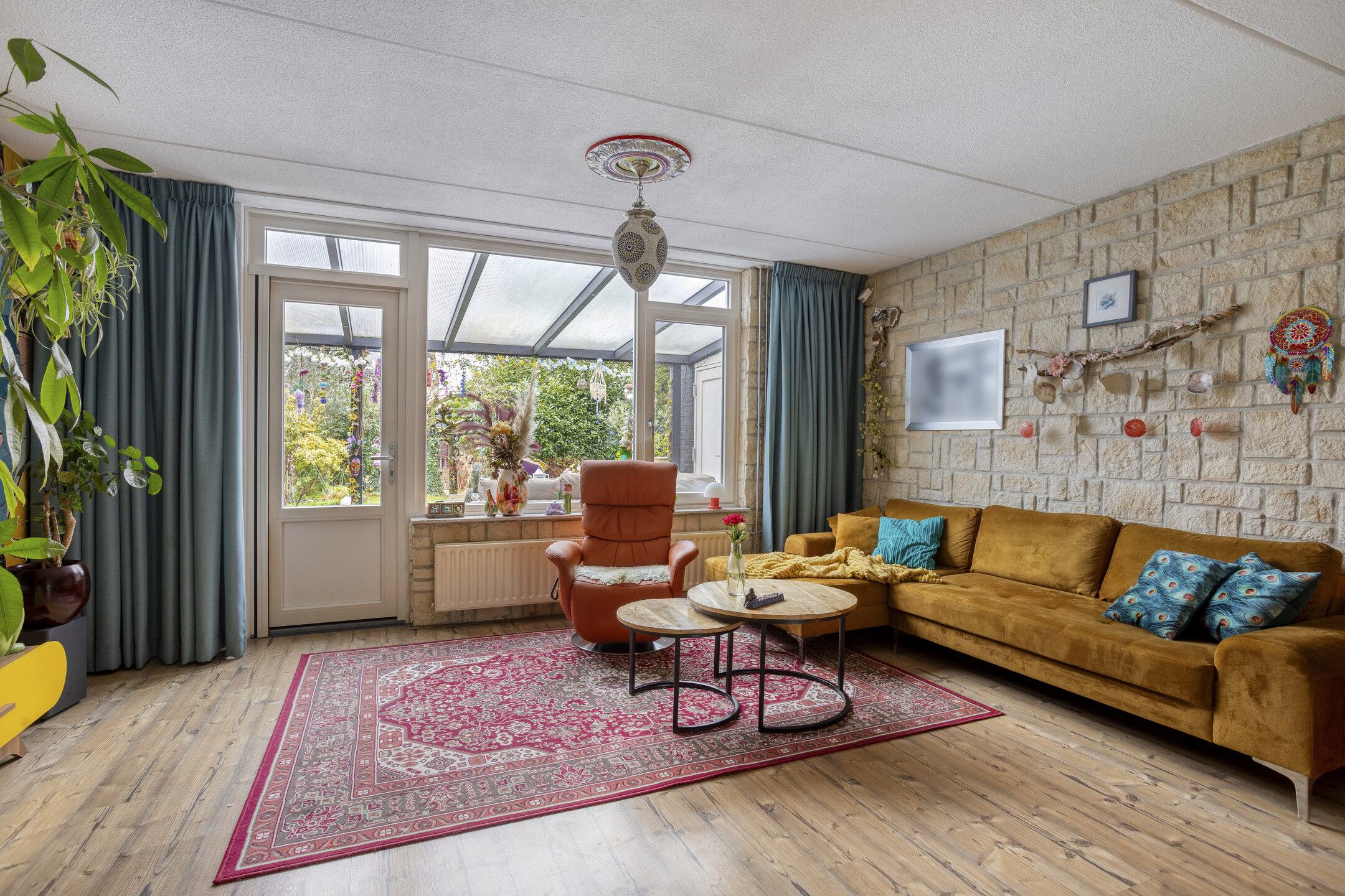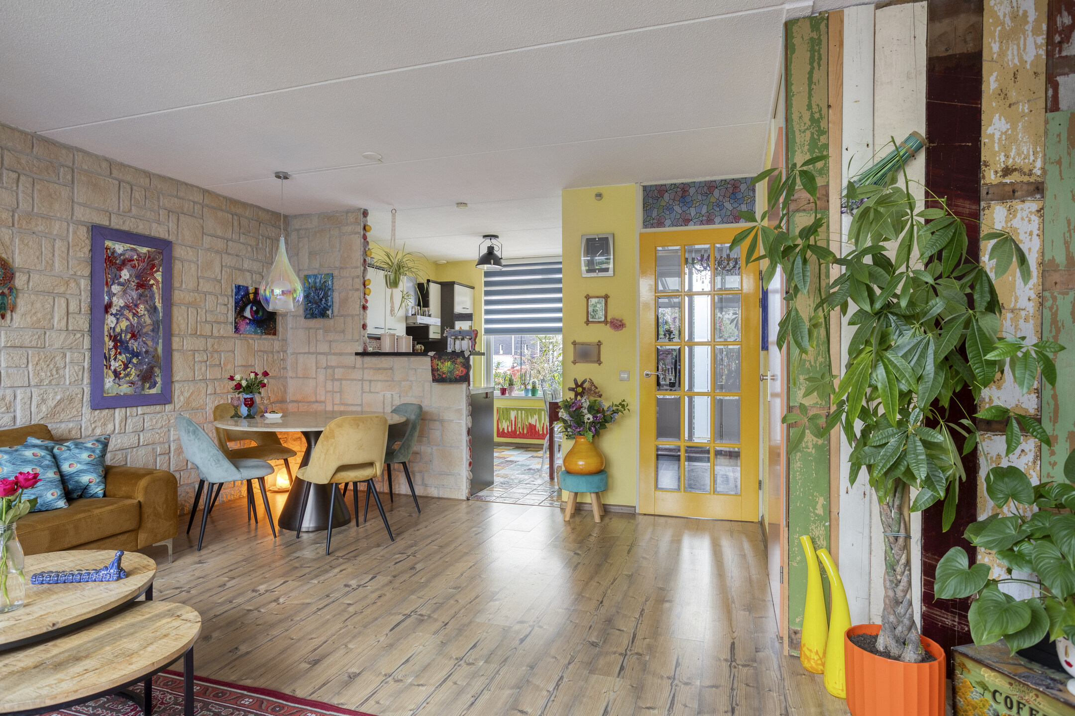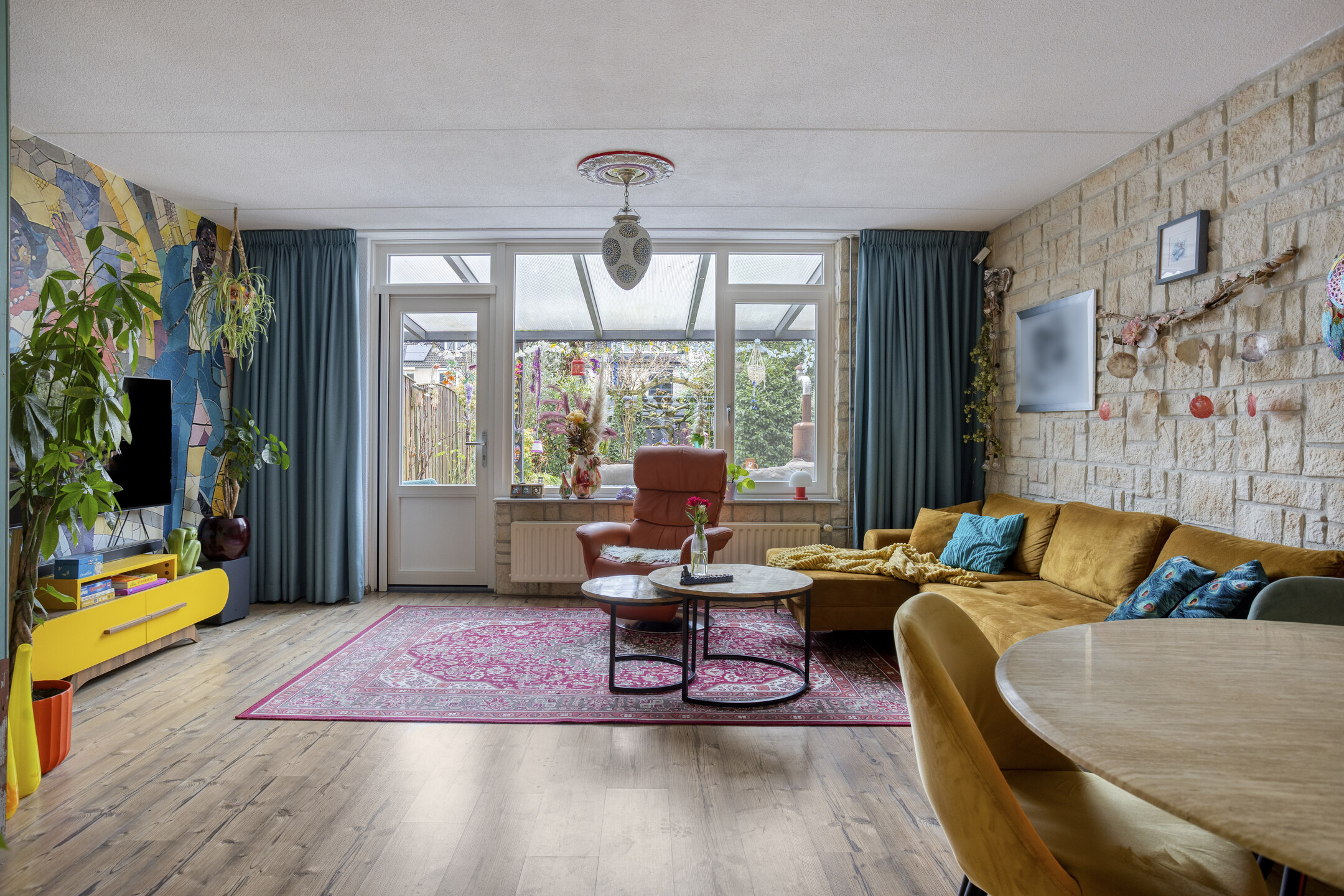 De woonkamer betreedt u ter hoogte van de eethoek. Aan de linkerzijde bevinden zich de trapopgang en een praktische trapkast. De zithoek is aan de achterzijde gesitueerd en biedt een prettig contact met de achtertuin. De laminaatvloer is hier doorgelegd, wat zorgt voor een rustige en samenhangende uitstraling.