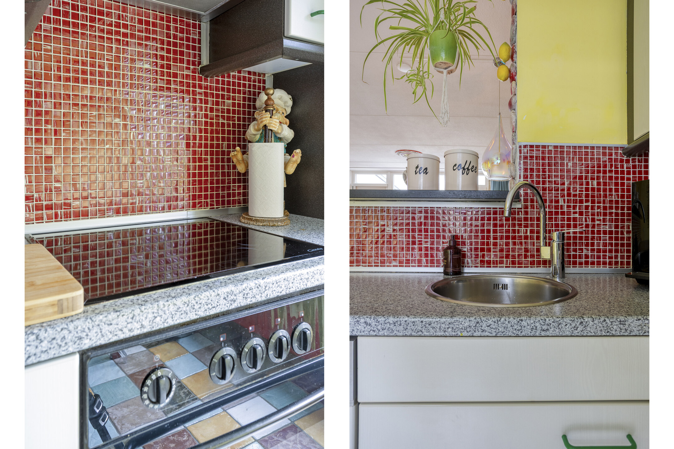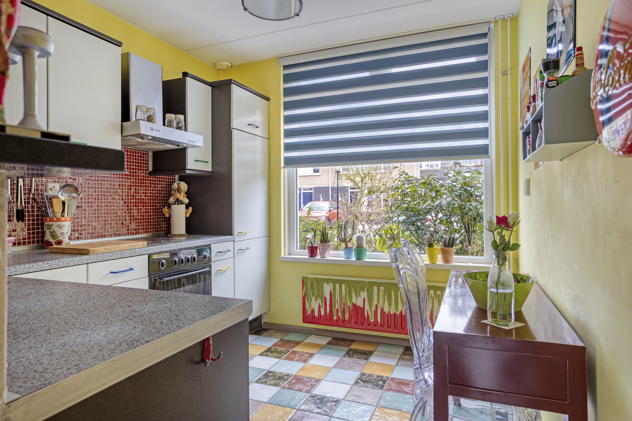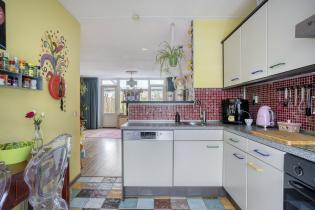 De keuken ligt aan de voorzijde van de woning en is uitgevoerd in een hoekopstelling. Deze is voorzien van een keramische kookplaat, afzuigkap, vaatwasmachine, oven en koelkast. Op de vloer liggen praktische tegels.