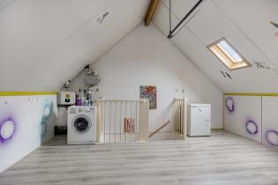 De ruime zolderverdieping is momenteel een open ruimte met aansluitingen voor de wasmachine en de unit van de mechanische ventilatie. Er ligt een laminaatvloer en er is veel bergruimte aanwezig achter de knieschotten.