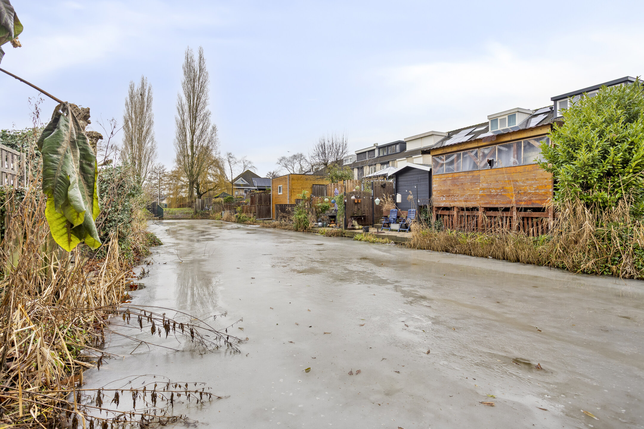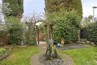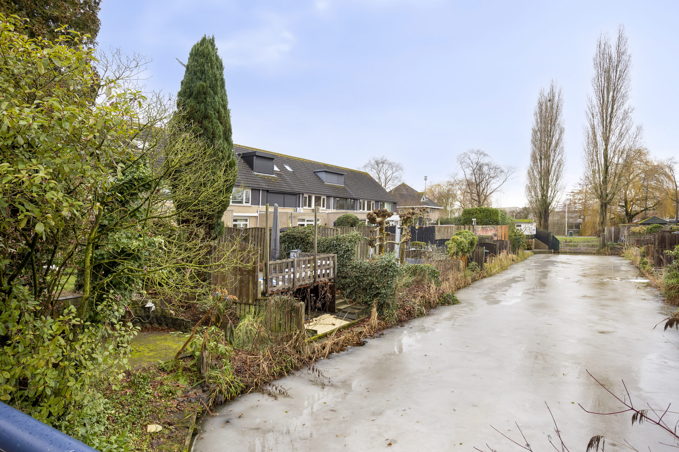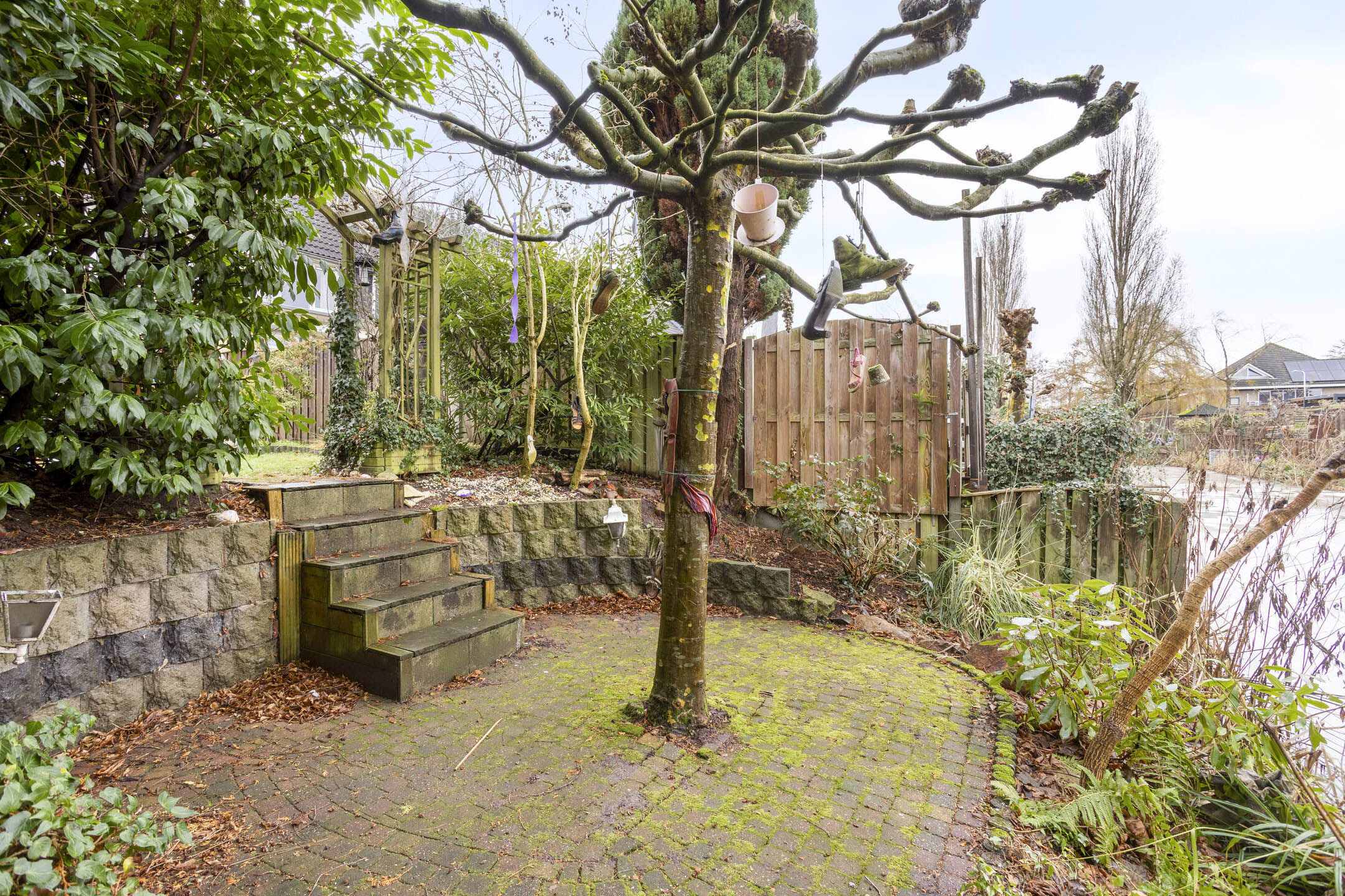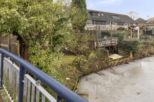 De tuin is verder ingericht met een gazon, diverse borders, een gezellig zitje achter de garage en een verdiept terras aan het water, een fijne plek om in alle rust te genieten van het buitenleven.