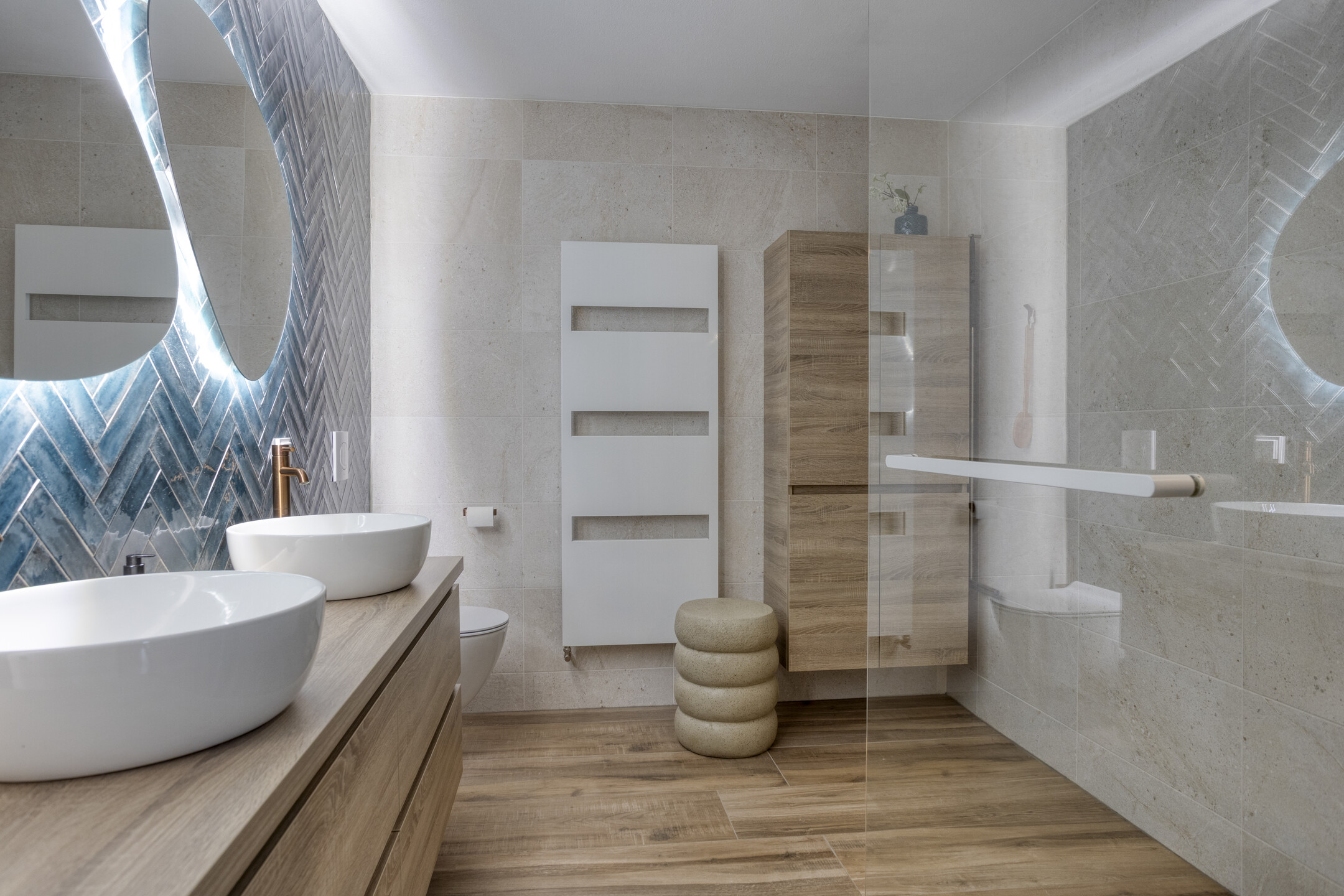 De badkamer is 2 jaar geleden volledig vernieuwd en vormt een echte eyecatcher. De ruimte is luxe afgewerkt en voorzien van een dubbel wastafelmeubel, een zwevend toilet, designradiator en een ruime inloopdouche met hand en stortdouche. Een moderne en stijlvolle badkamer waar comfort centraal staat.