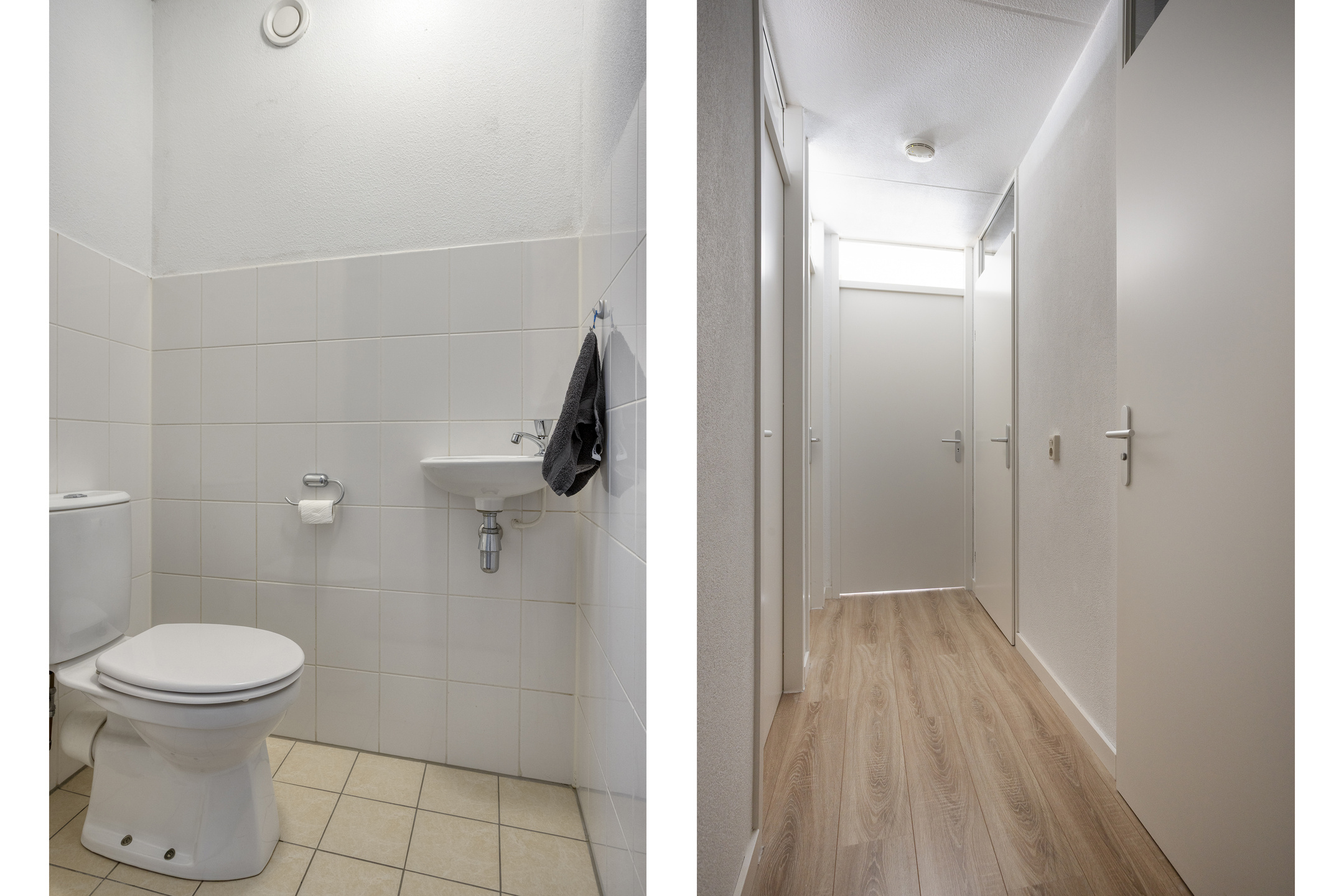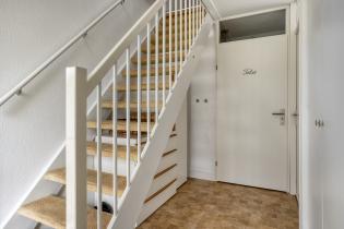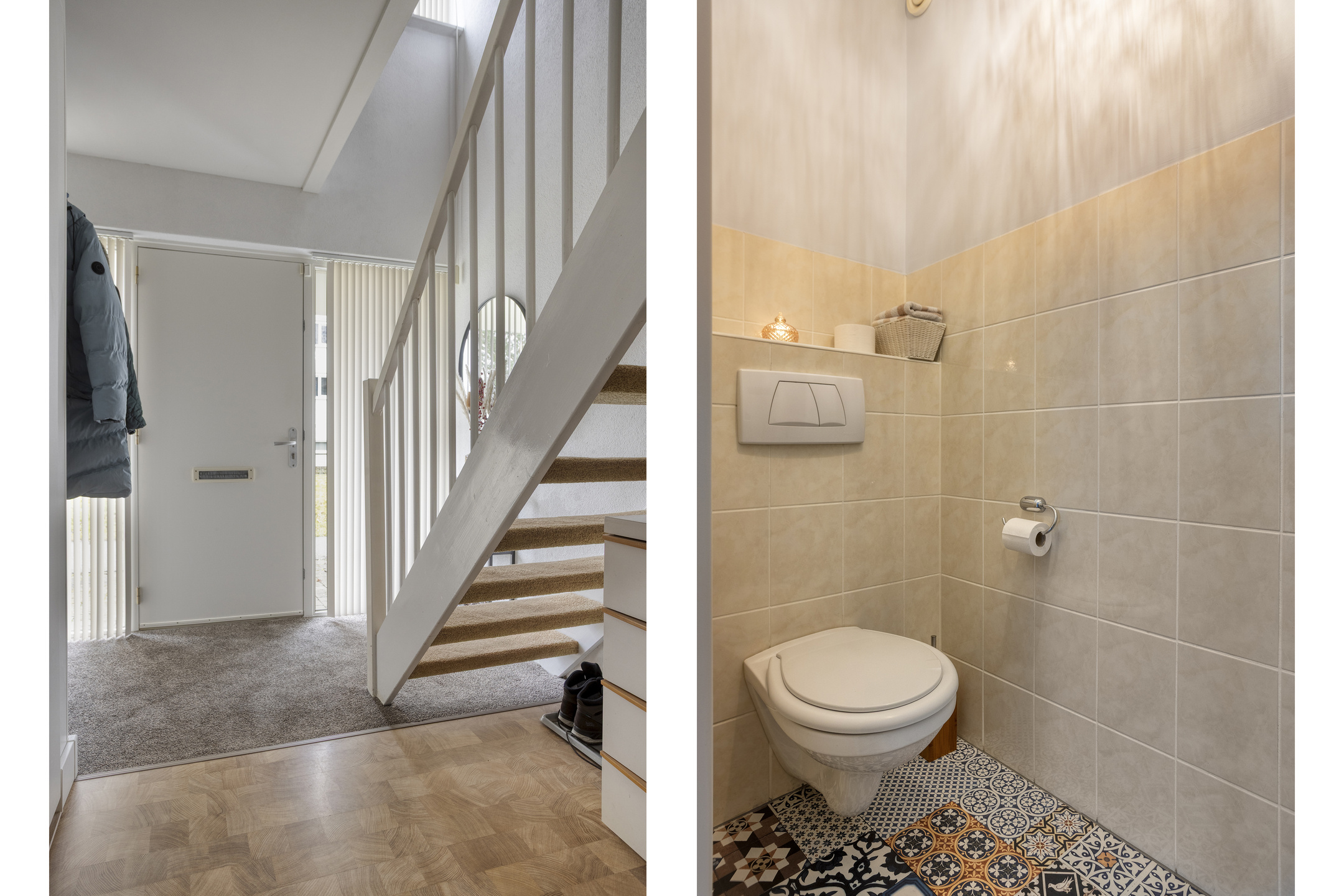 Via de entree kom je binnen in de hal met meterkast, toiletruimte en trapopgang. Het toilet is deels betegeld en voorzien van een hangend closet en fonteintje. De laminaatvloer die hier is gelegd loopt door over de gehele begane grond en zorgt voor een rustige en verzorgde uitstraling.