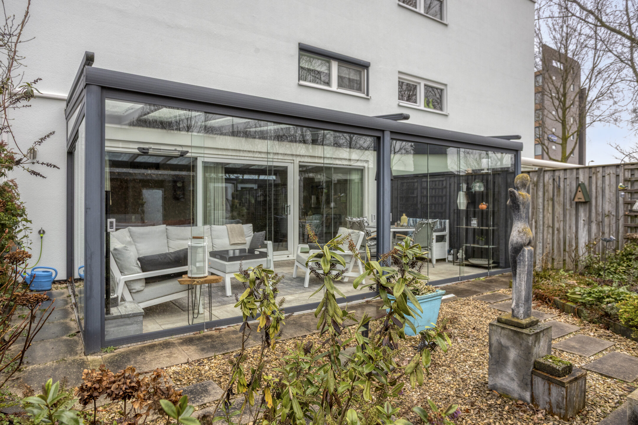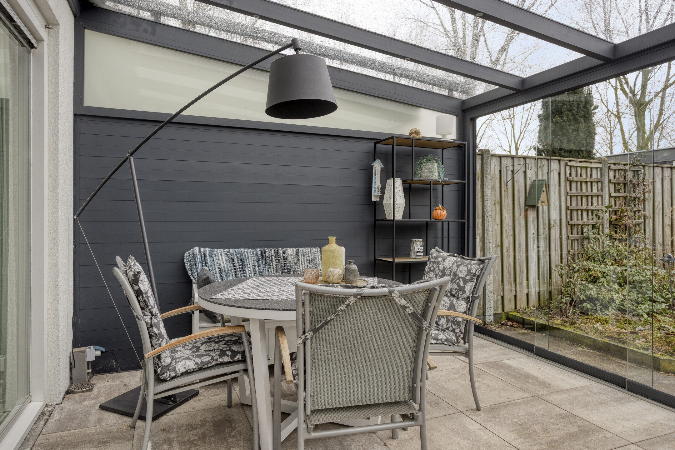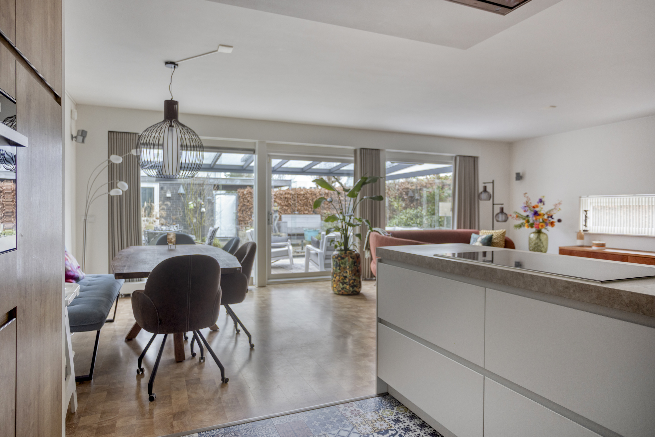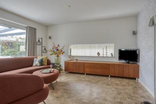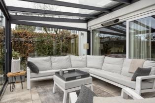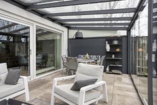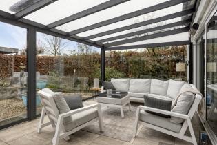 Via de schuifpui bereik je de ruime serre, een heerlijke verlenging van de woonkamer. Deze ruimte verbindt binnen en buiten op een natuurlijke manier en fungeert als tweede woonkamer. Dankzij de glazen schuifwanden kun je hier vrijwel het hele jaar door genieten van het buitengevoel. De serre is voorzien van ingebouwde verlichting en een zonnescherm aan de bovenzijde, waardoor het ook op warme dagen comfortabel blijft.
