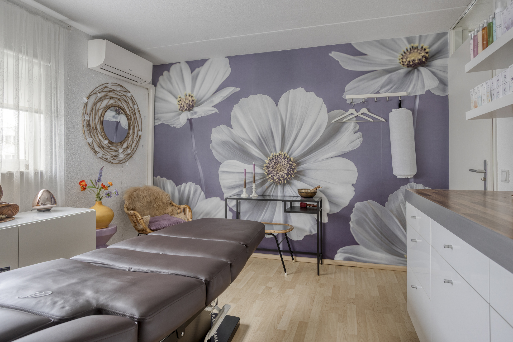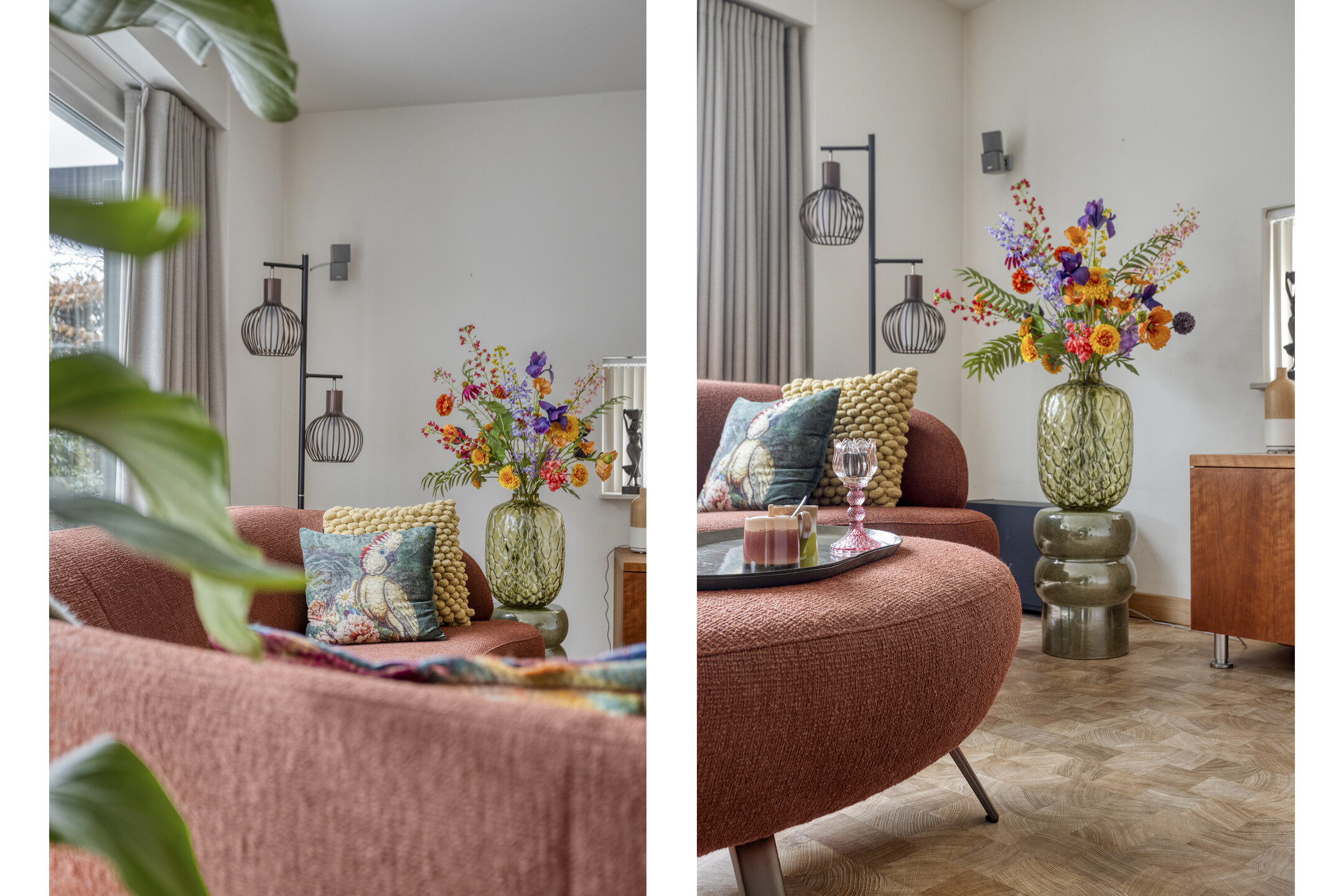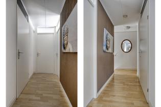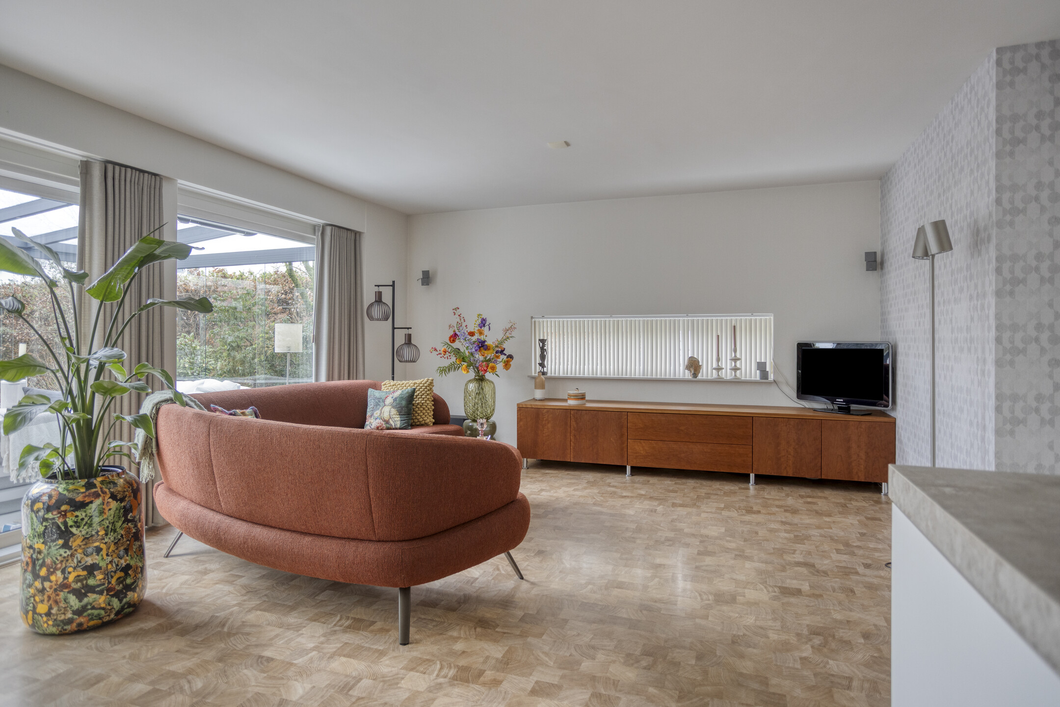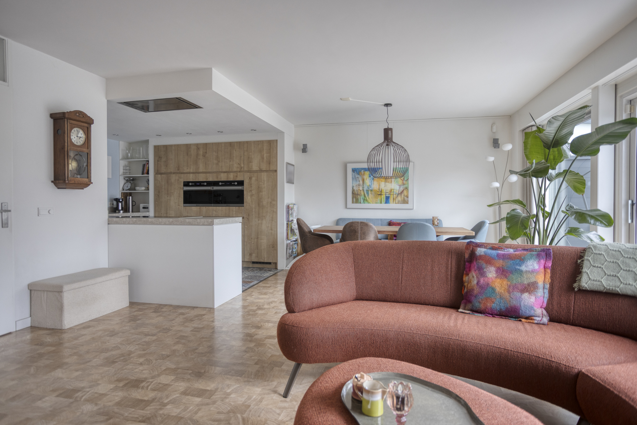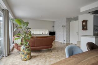 De woonkamer is prettig ingedeeld met aan de rechterzijde de zithoek en aan de linkerzijde de eethoek bij de keuken. De ruimte is licht en sfeervol afgewerkt met behangen wanden en een strak gestuukt plafond. Er is voldoende plaats voor een comfortabele zithoek én een royale eettafel waar het gezin samenkomt.