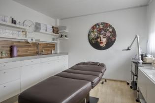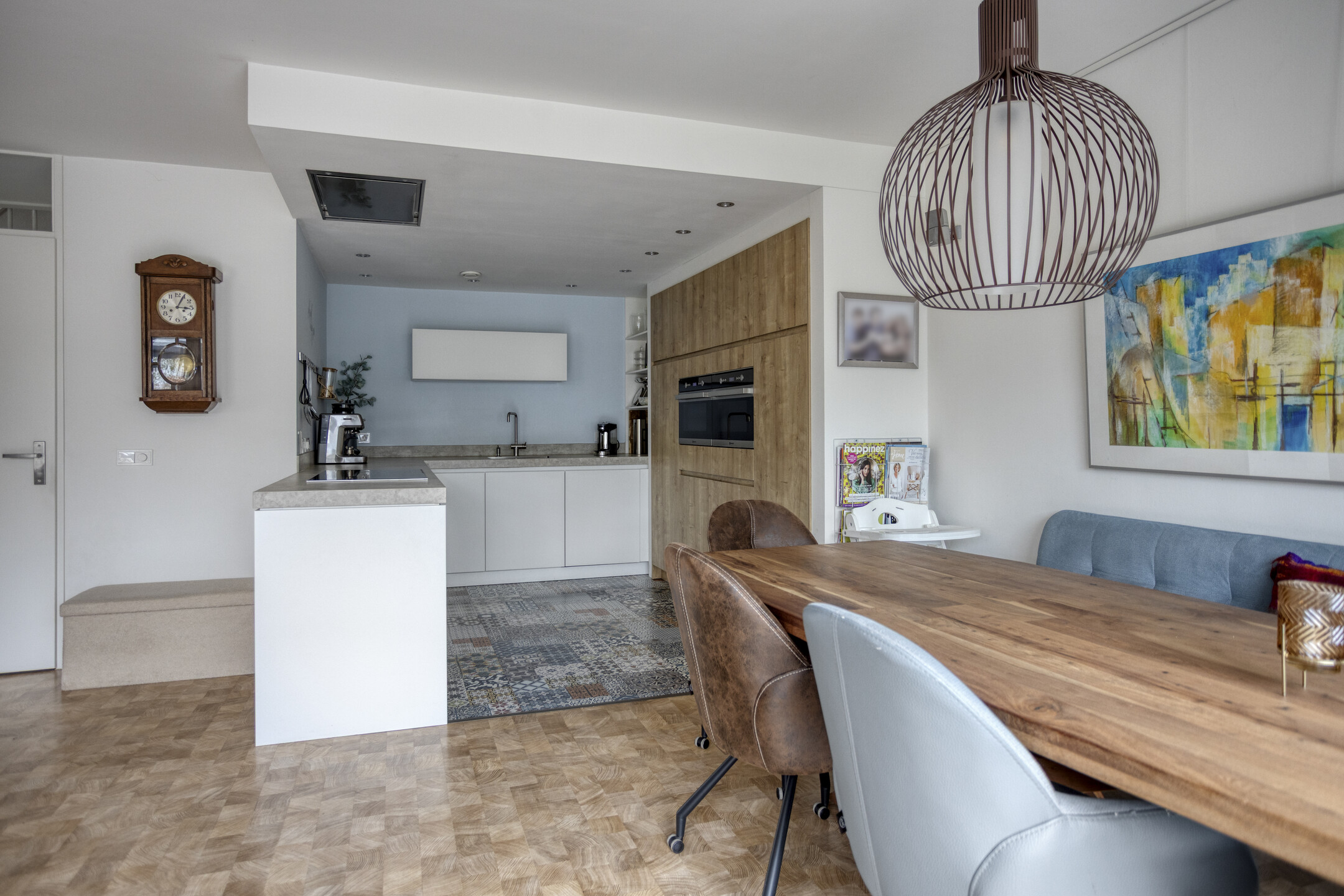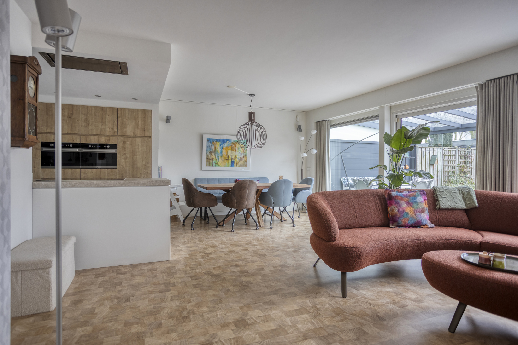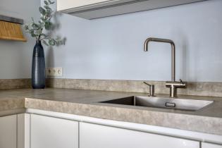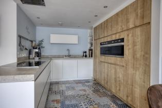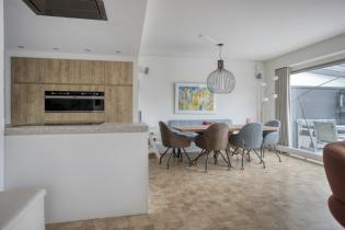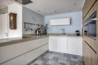 De moderne keuken is ruim opgezet met laminaatvloer en uitgevoerd in een hoekopstelling met een extra kastenwand, waardoor er veel werk en bergruimte aanwezig is. De keuken beschikt over een inductiekookplaat, een in het plafond geïntegreerde afzuigkap, vaatwasser, oven, magnetron en koelkast met aparte diepvriezer. Een complete en eigentijdse keuken die perfect aansluit bij het gezinsleven.