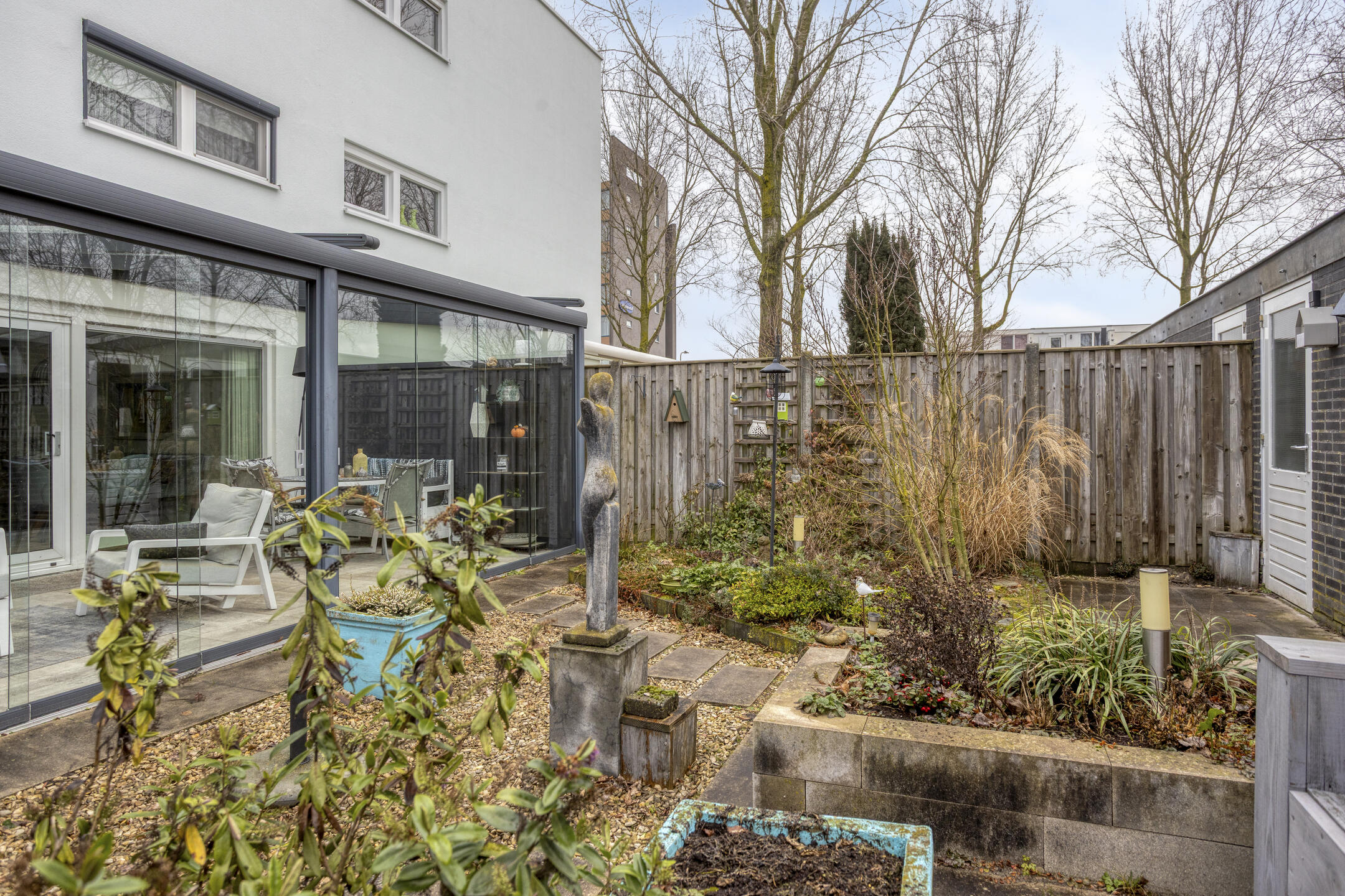De tuin is verzorgd aangelegd met borders, een extra terras en een buitenkraan. Vanuit de tuin is zowel de garage als de achterom bereikbaar, waarbij je onder de carport uitkomt.