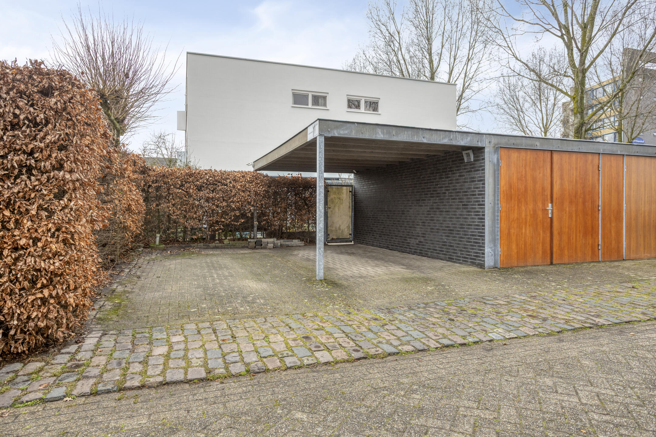 De garage is een praktische bergruimte met elektra. De auto kan onder de carport worden geparkeerd en daarnaast is er nog een extra parkeerplaats beschikbaar.