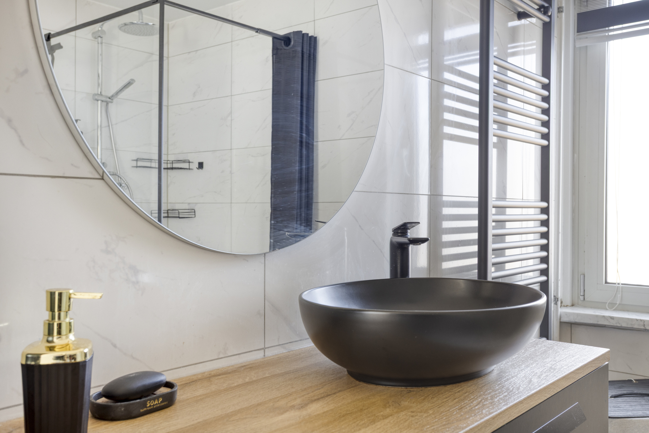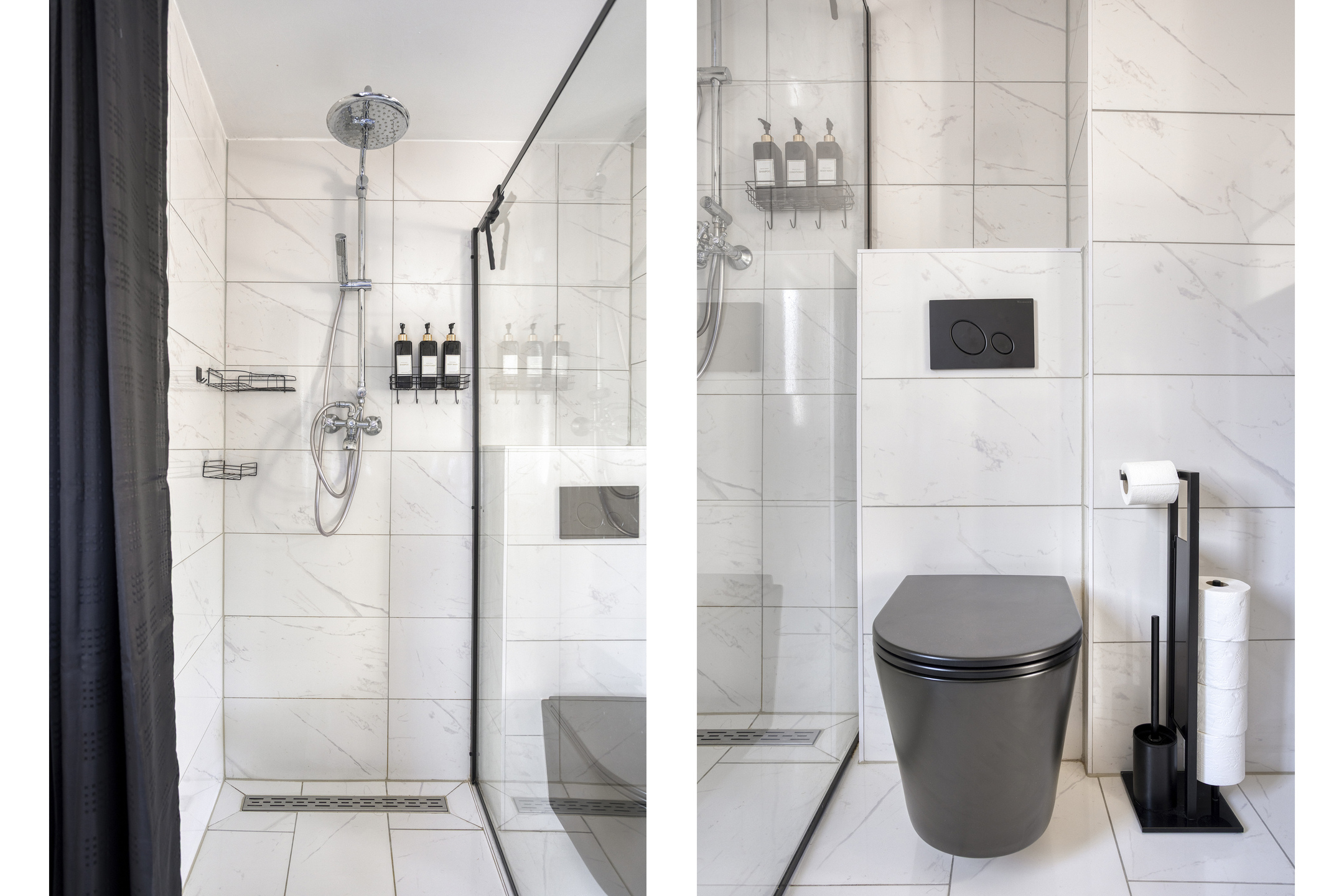 De moderne badkamer is compleet uitgevoerd en beschikt over een comfortabele inloopdouche, een toilet en een wastafel.