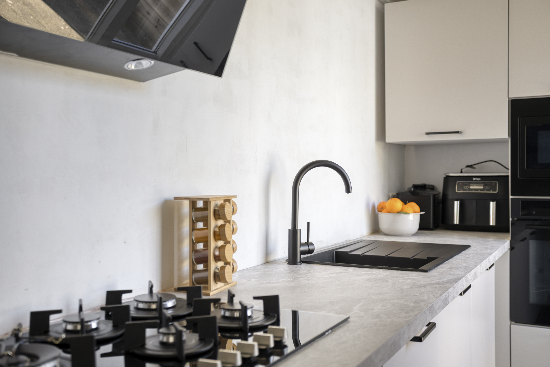 De moderne keuken is aan de achterzijde geleden en is voorzien van luxe inbouwapparatuur, waaronder een oven, magnetron, 5-pits gascomfort en moderne afzuigkap.