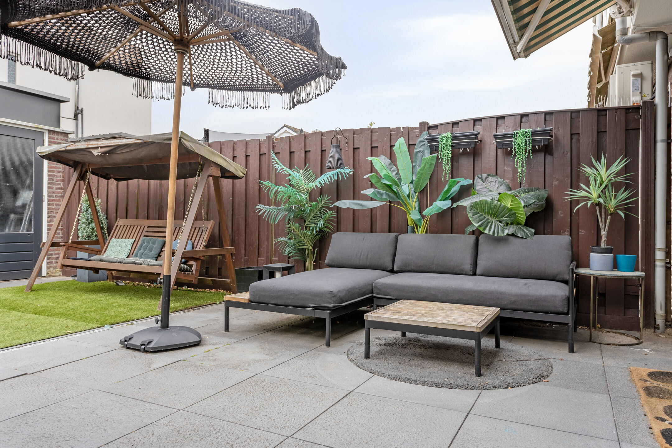 De achtertuin is verzorgd aangelegd met kunstgras, een overkapping, verlichting, een berging en een achterom. Een fijne plek om in alle seizoenen van te genieten. Aan de voorzijde van de woning is een beukenhaag aangebracht en is er een wateraansluiting aanwezig.