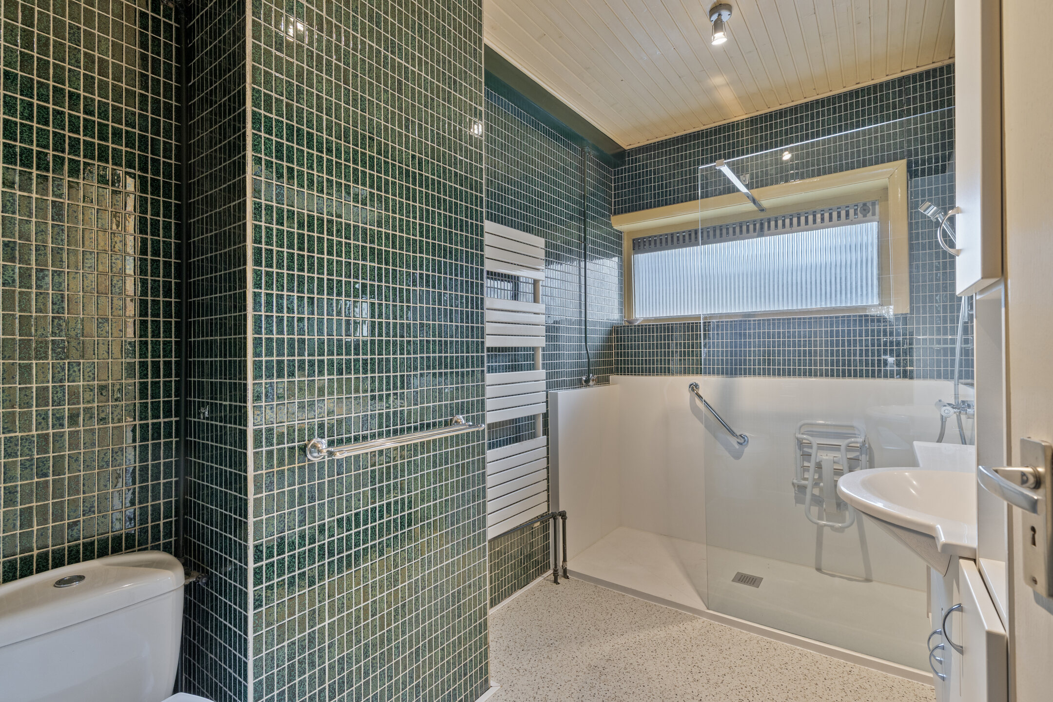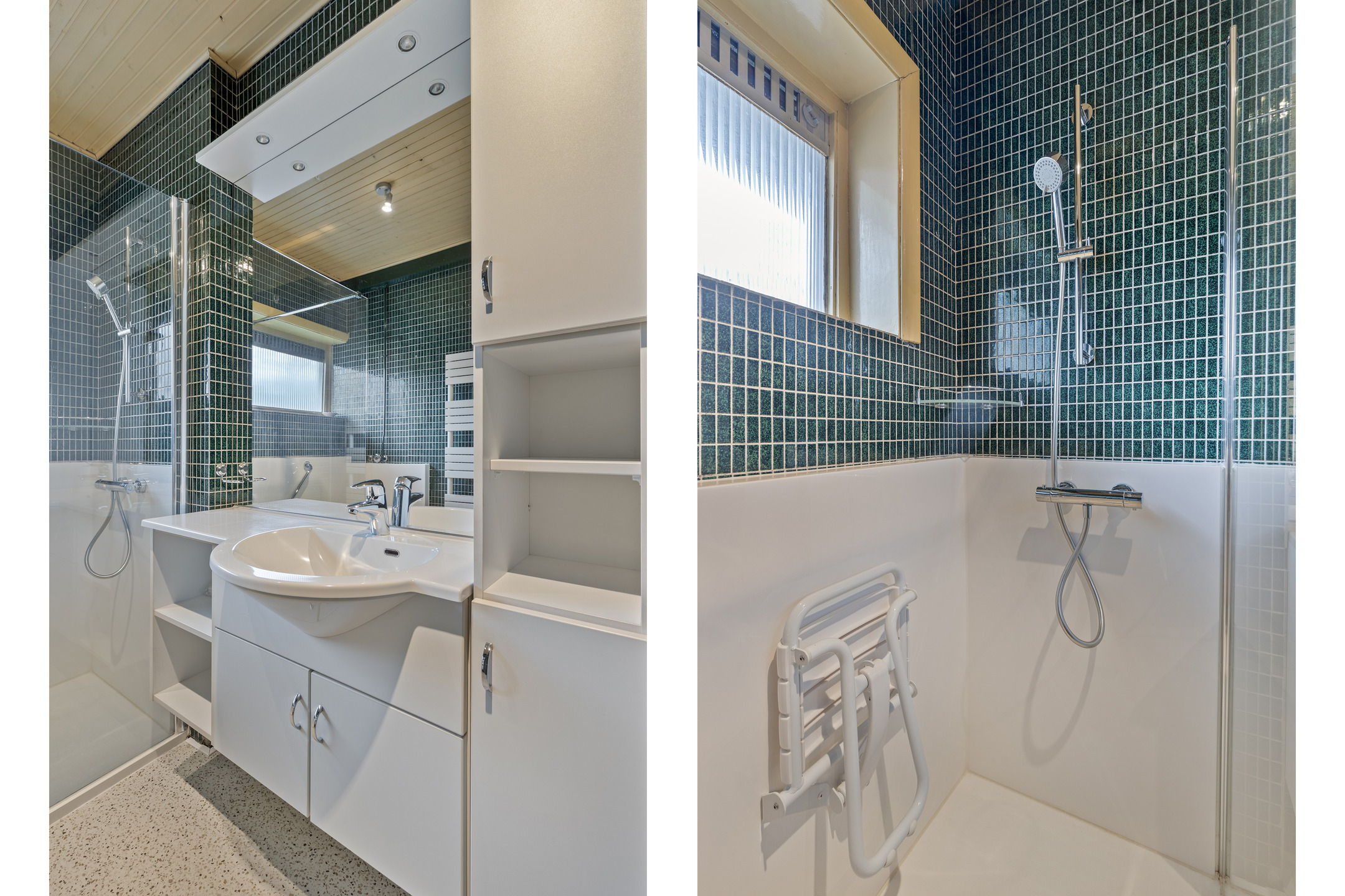 De badkamer is praktisch ingedeeld en biedt toegang vanaf zowel de hoofdslaapkamer als de overloop. De ruimte is voorzien van een wastafelmeubel, een staand toilet, een designradiator en een ruime inloopdouche die enkele jaren geleden vernieuwd is. Hoewel de badkamer functioneel is, biedt deze volop mogelijkheden om gemoderniseerd te worden en naar eigen smaak in te richten.
