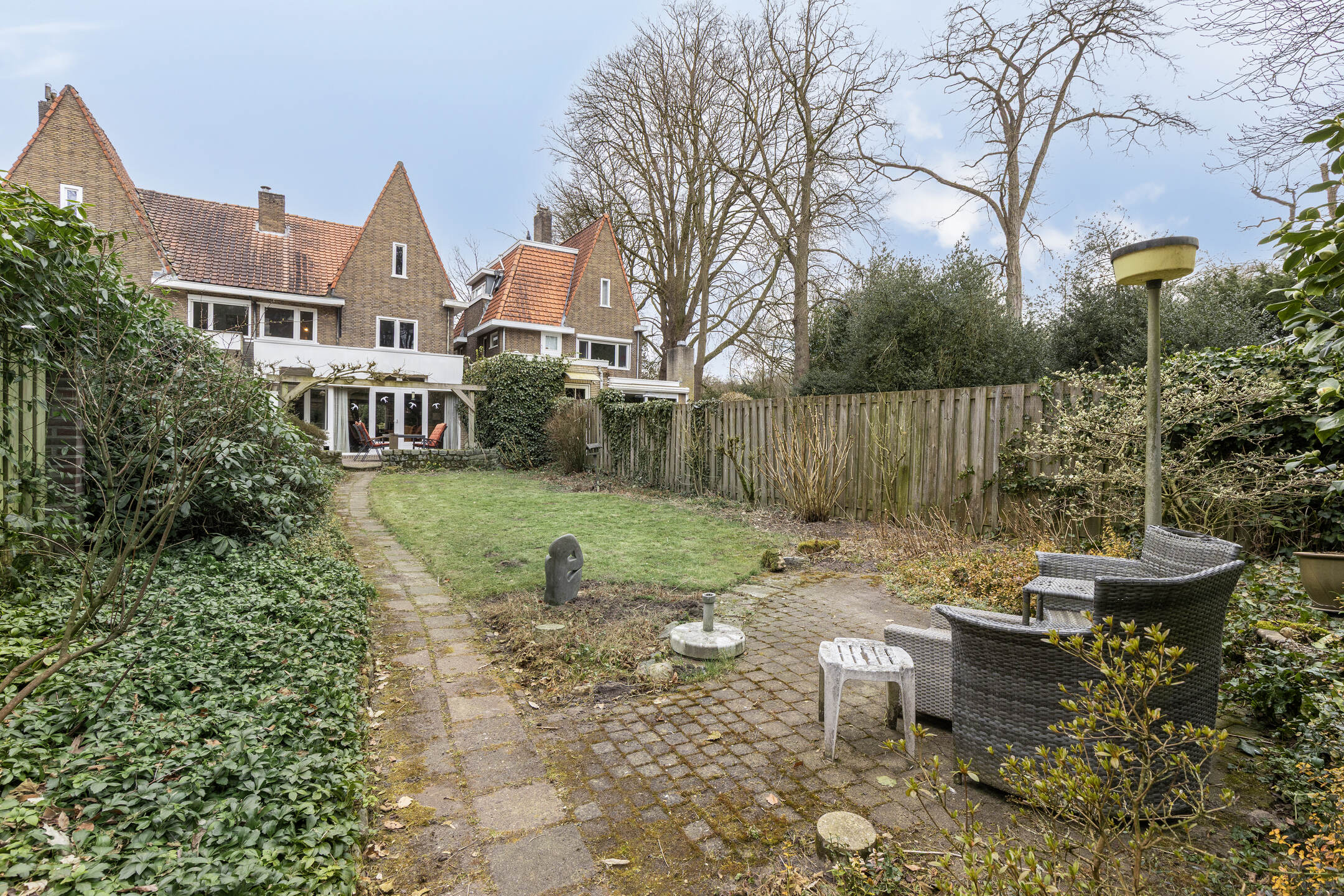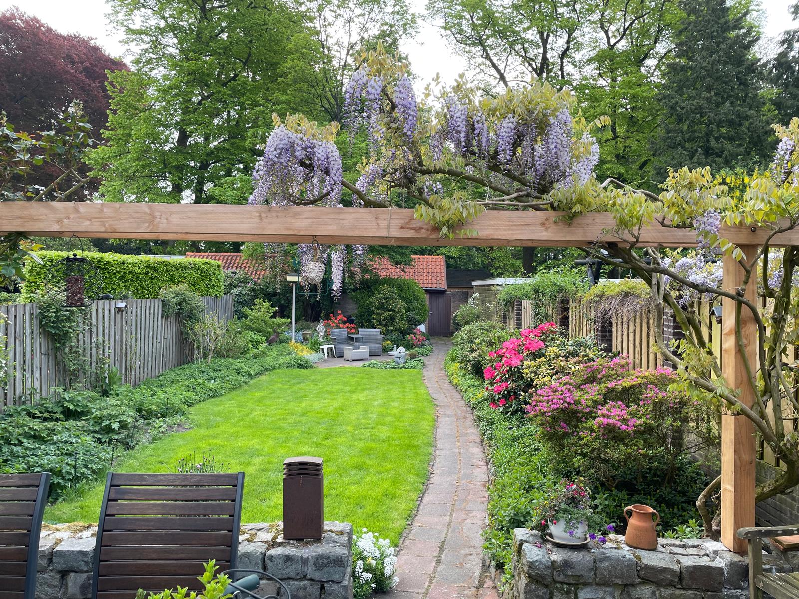De diepe en brede achtertuin is een ware oase van rust. Dankzij de bosrijke ligging en het ontbreken van directe achterburen geniet je hier van maximale privacy. Een ruim terras bij de woning, met een pergola die zomers schaduw biedt door de blauwe regen die eroverheen is geleid, biedt een fijne plek om te ontspannen, terwijl het gazon, de diverse beplanting en de borders met groen voor een natuurlijke uitstraling zorgen. Achter in de tuin bevindt zich een royale garage met een nok en vliering, perfect voor opslag of het stallen van een auto. De garage zelf is ruim genoeg voor een normale auto, maar de toegangsweg is slechts breed genoeg voor een kleinere auto. De garage is voorzien van water en elektra en bereikbaar via de achterom.