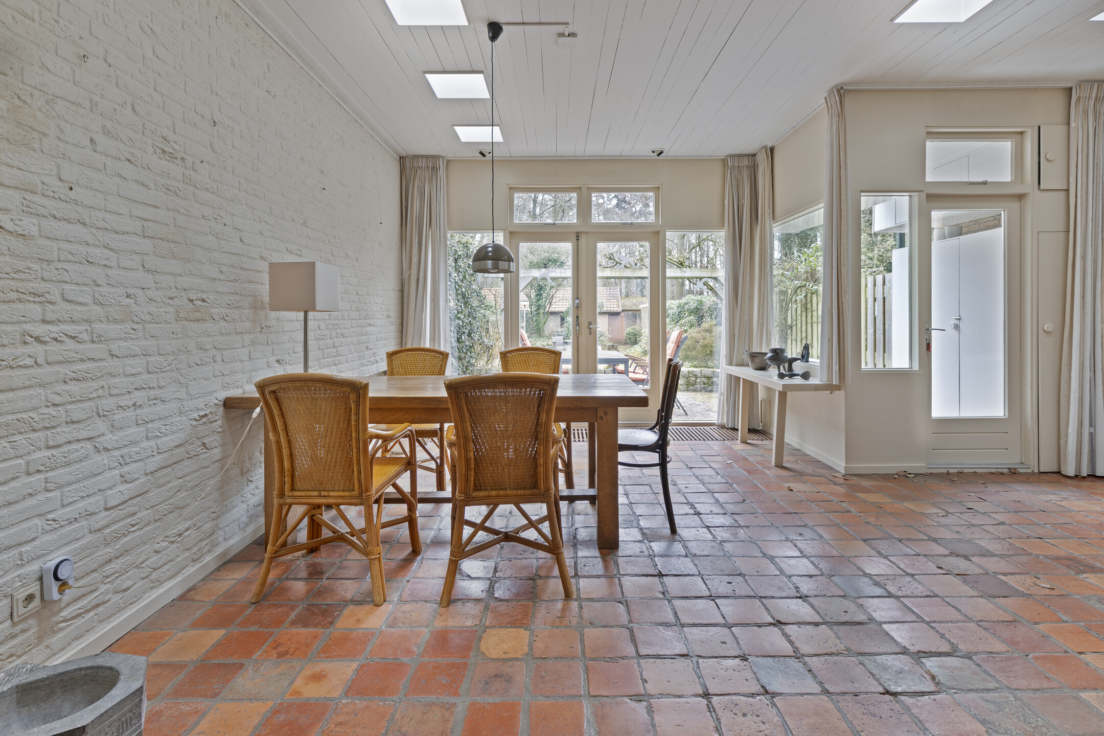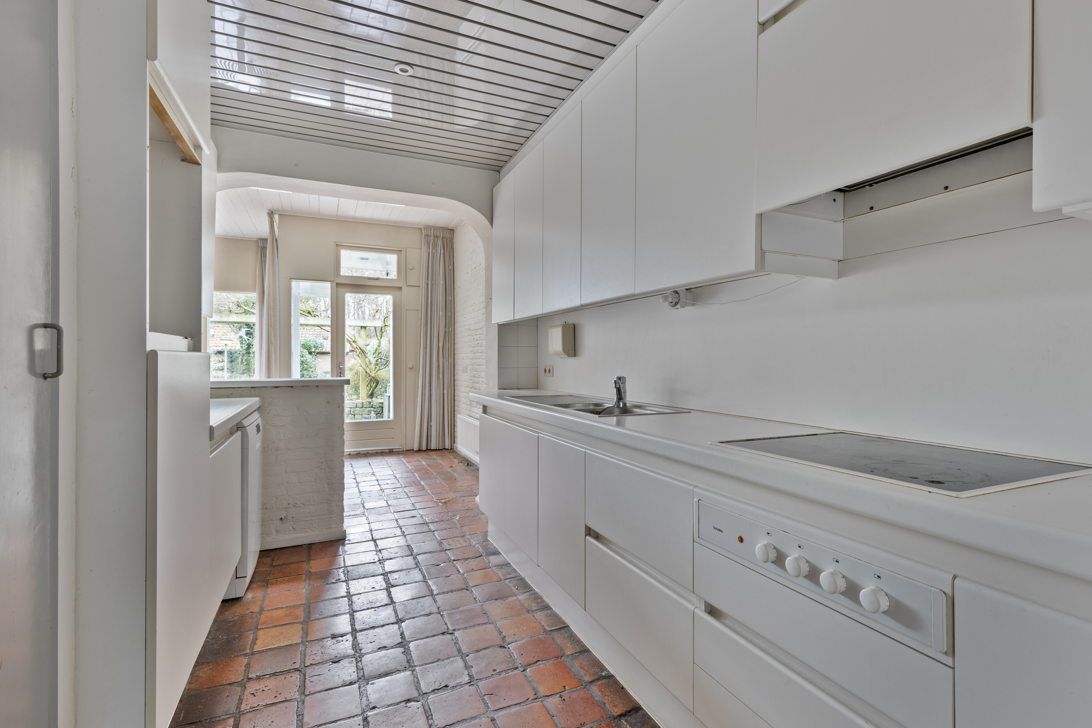 Achter de woonkamer bevindt zich de tuinkamer, een veelzijdige ruimte met direct zicht op de diepe achtertuin die eveneens verwarmd wordt via een convectorput. Deze ruimte leent zich perfect voor een grote woonkeuken. Met een directe verbinding naar de tuin en de mogelijkheid om hier een ruim kook- en eetgedeelte te realiseren, wordt dit het hart van de woning. De tuinkamer grenst aan de bestaande keuken, die nu nog een dubbele rechte opstelling heeft met veel kastruimte en is voorzien van een elektrische kookplaat, afzuigkap en koelkast. Door de keuken open te breken en te betrekken bij de tuinkamer, ontstaat een royale woonkeuken waar je heerlijk kunt koken en tafelen met uitzicht op de tuin. In zowel de keuken als de tuinkamer ligt een boeren plavuizen vloer.