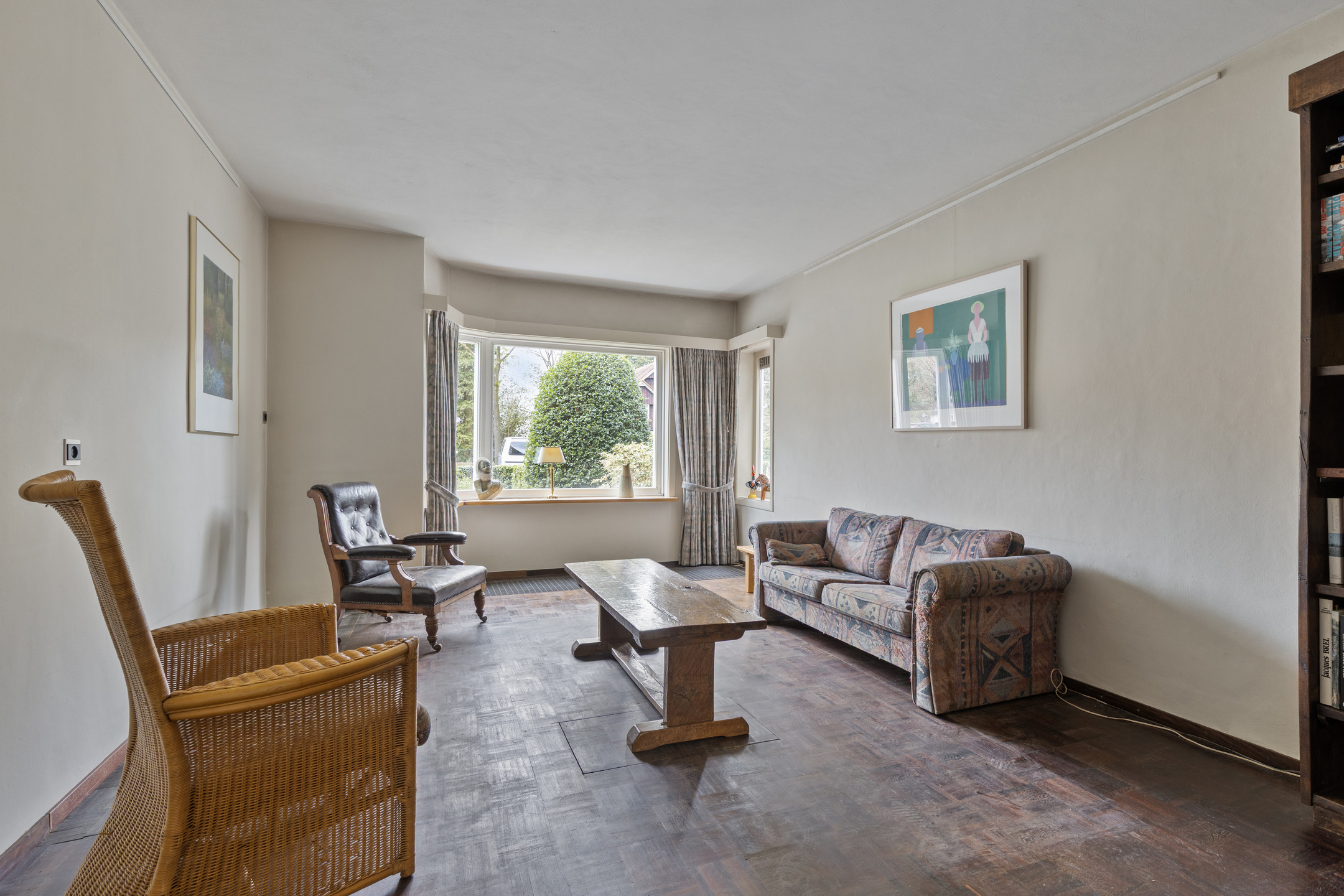 De woonkamer is opvallend diep en biedt volop ruimte voor een royale zit- en eethoek. Dankzij de erker aan de voorzijde en de lange zichtlijn naar de tuin voelt de ruimte extra licht en open. Aan de zijgevel zijn twee reeksen van vier glas-in-loodramen aanwezig, die momenteel zijn dichtgezet, maar eenvoudig weer in het zicht gebracht kunnen worden voor extra lichtinval en een karakteristieke uitstraling. In de woonkamer ligt een parketvloer en de convectorput zorgt voor een aangename verwarming.